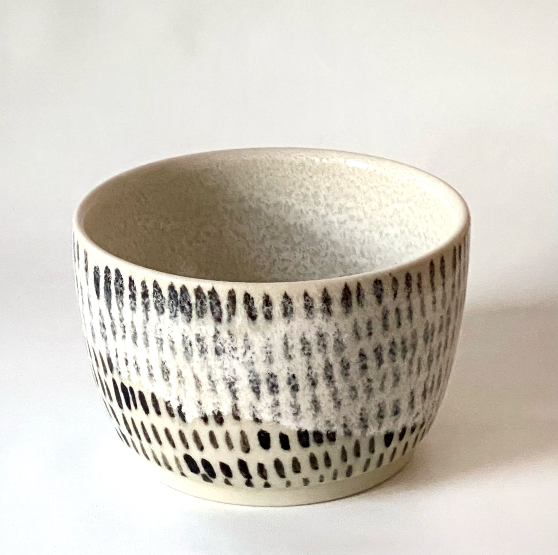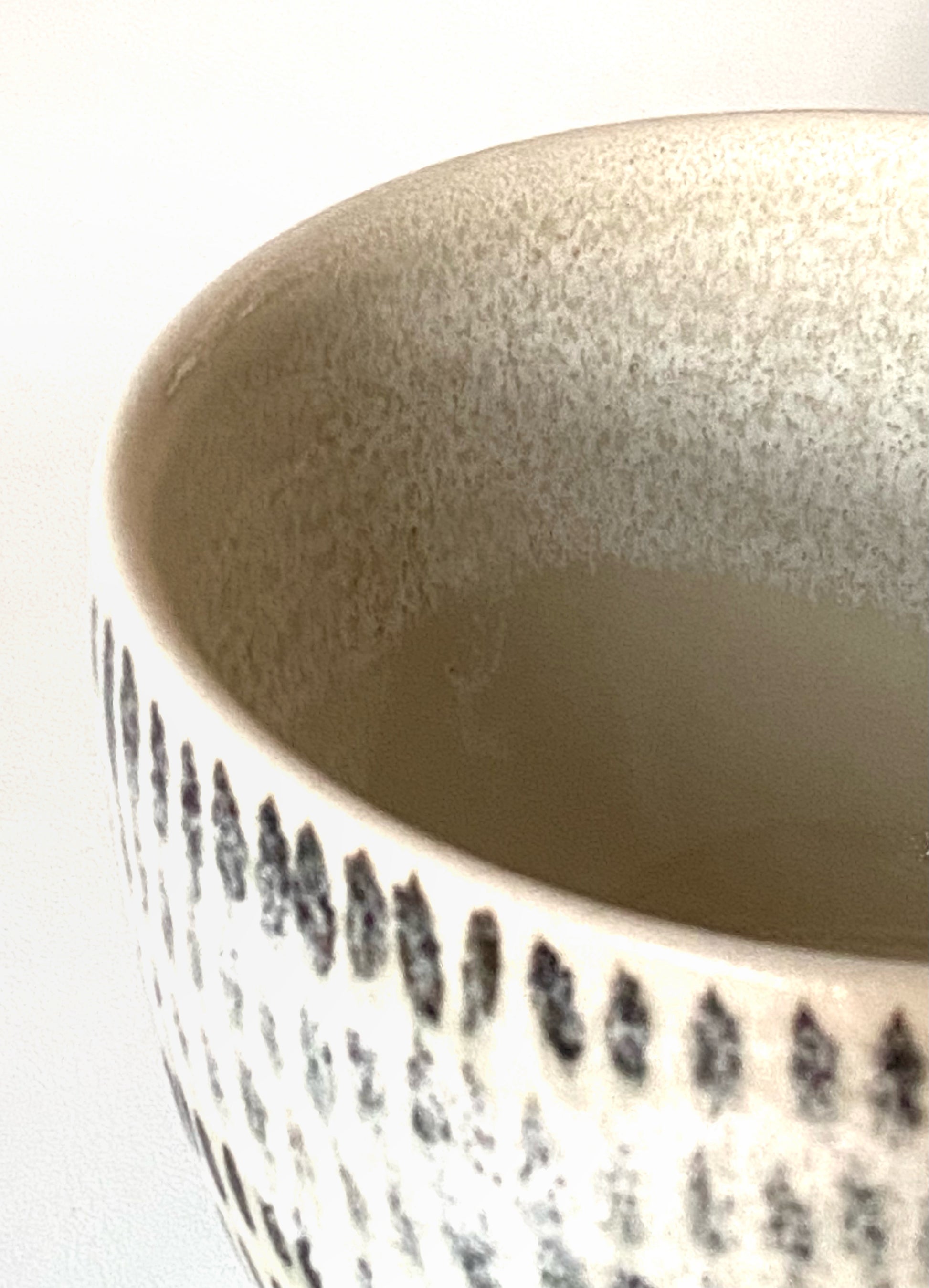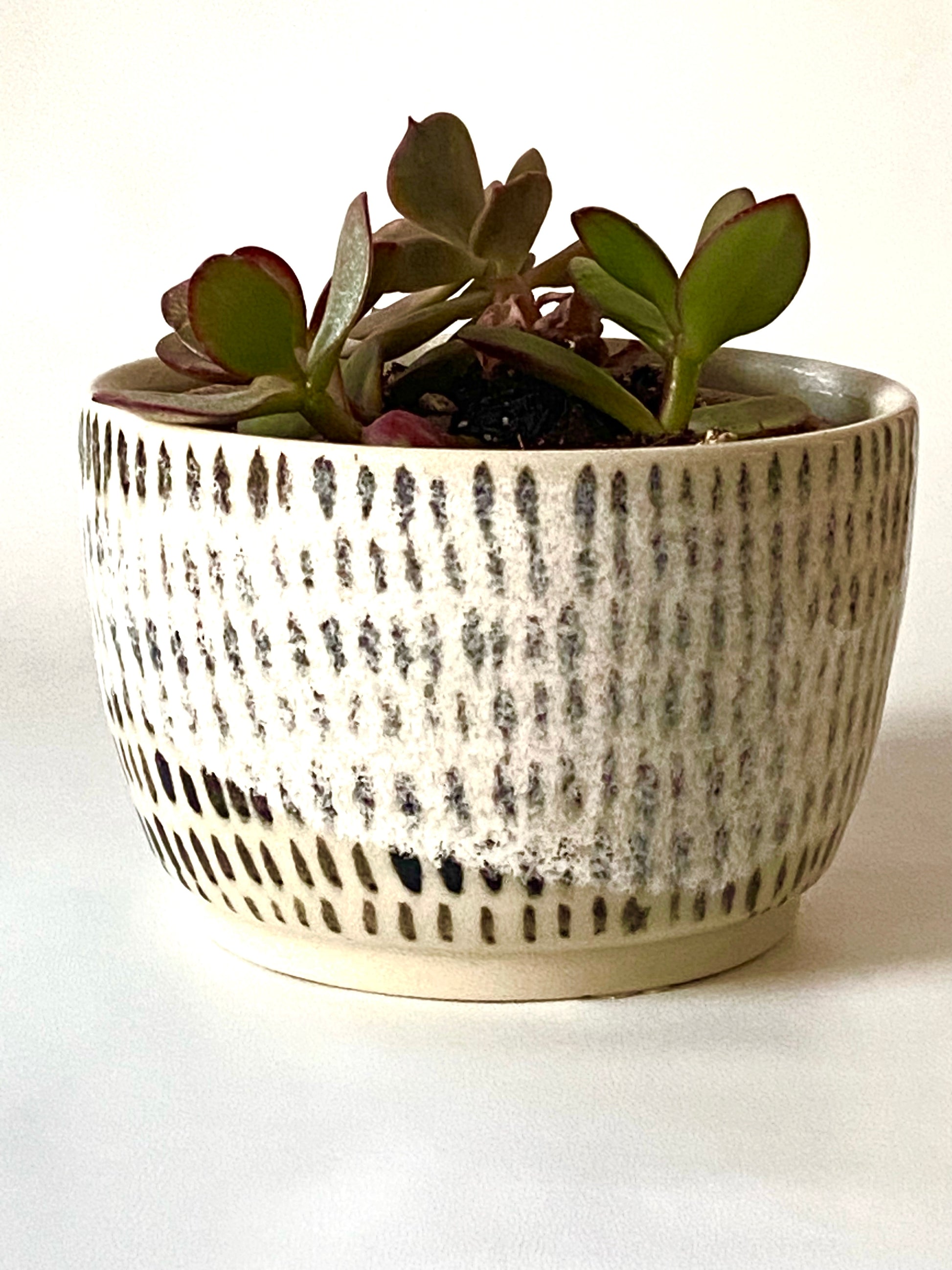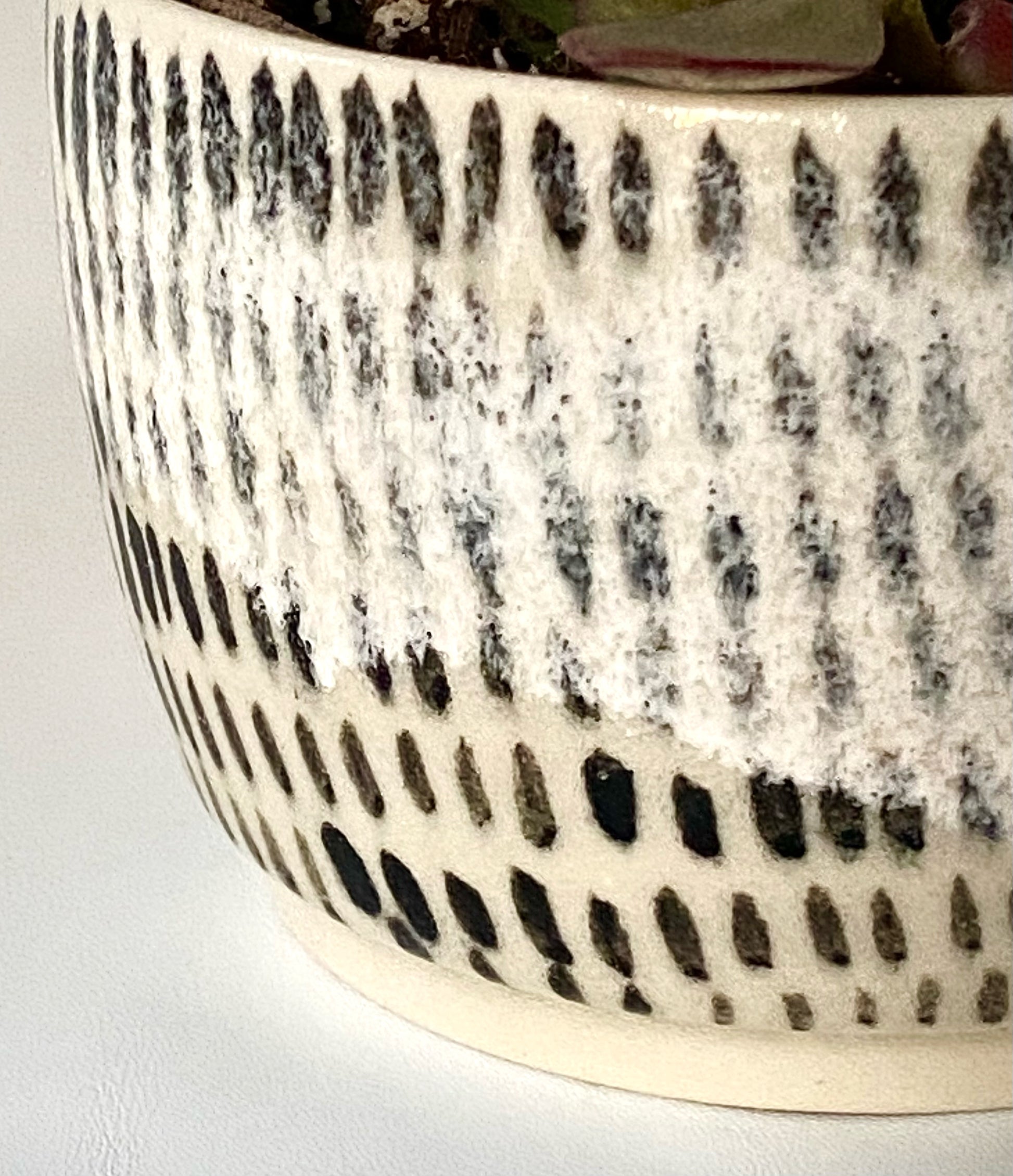 Small stoneware planter, accented with black streaks and a sheer white glaze. Simple yet crafted with care.