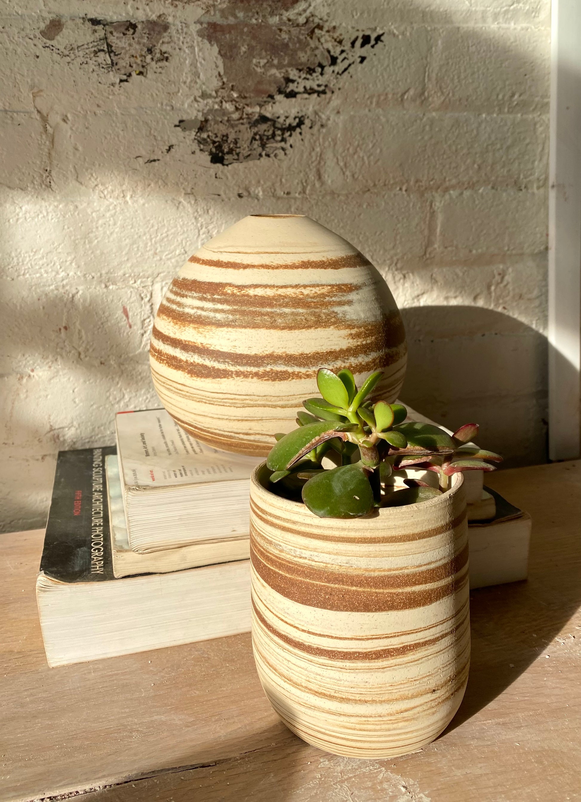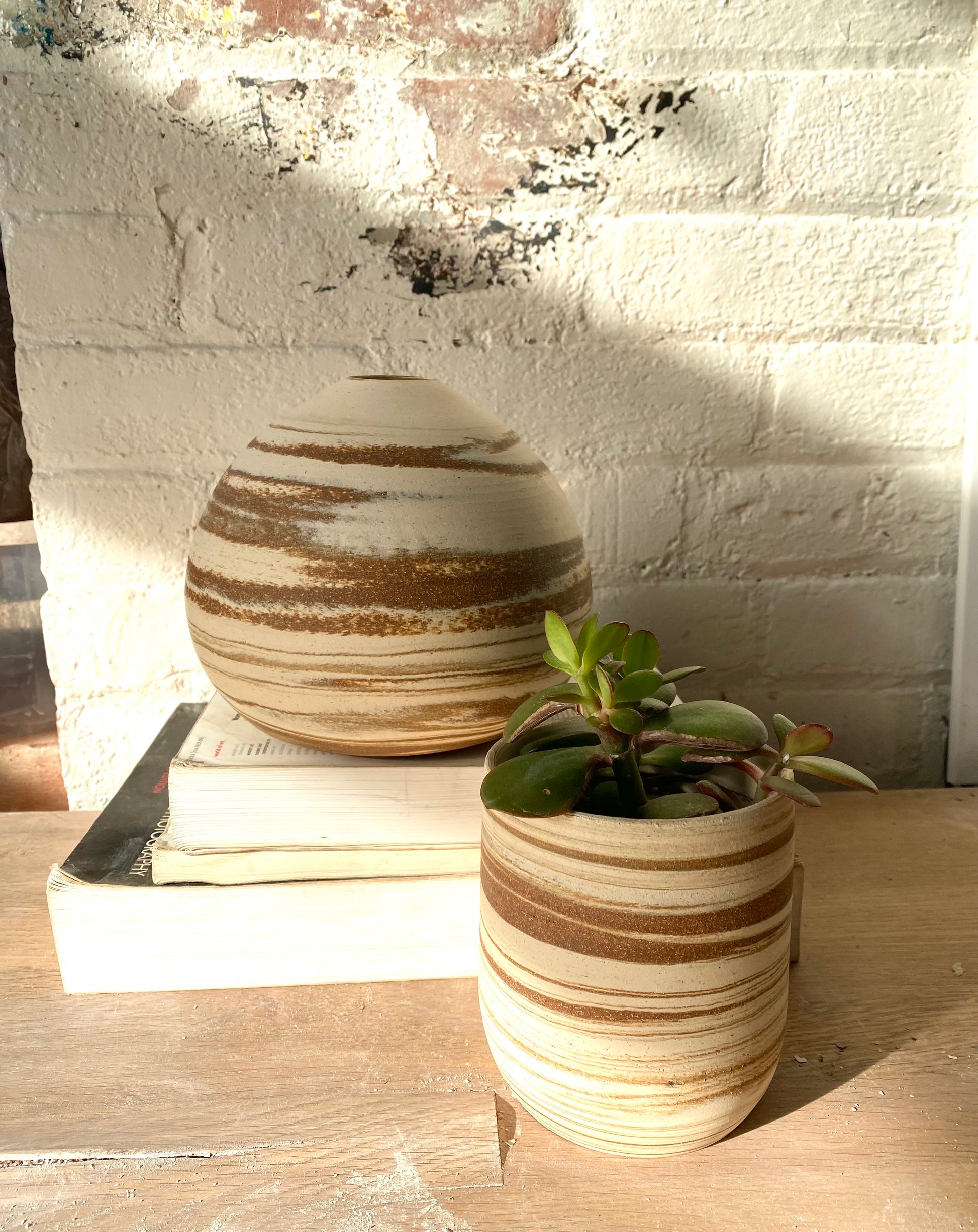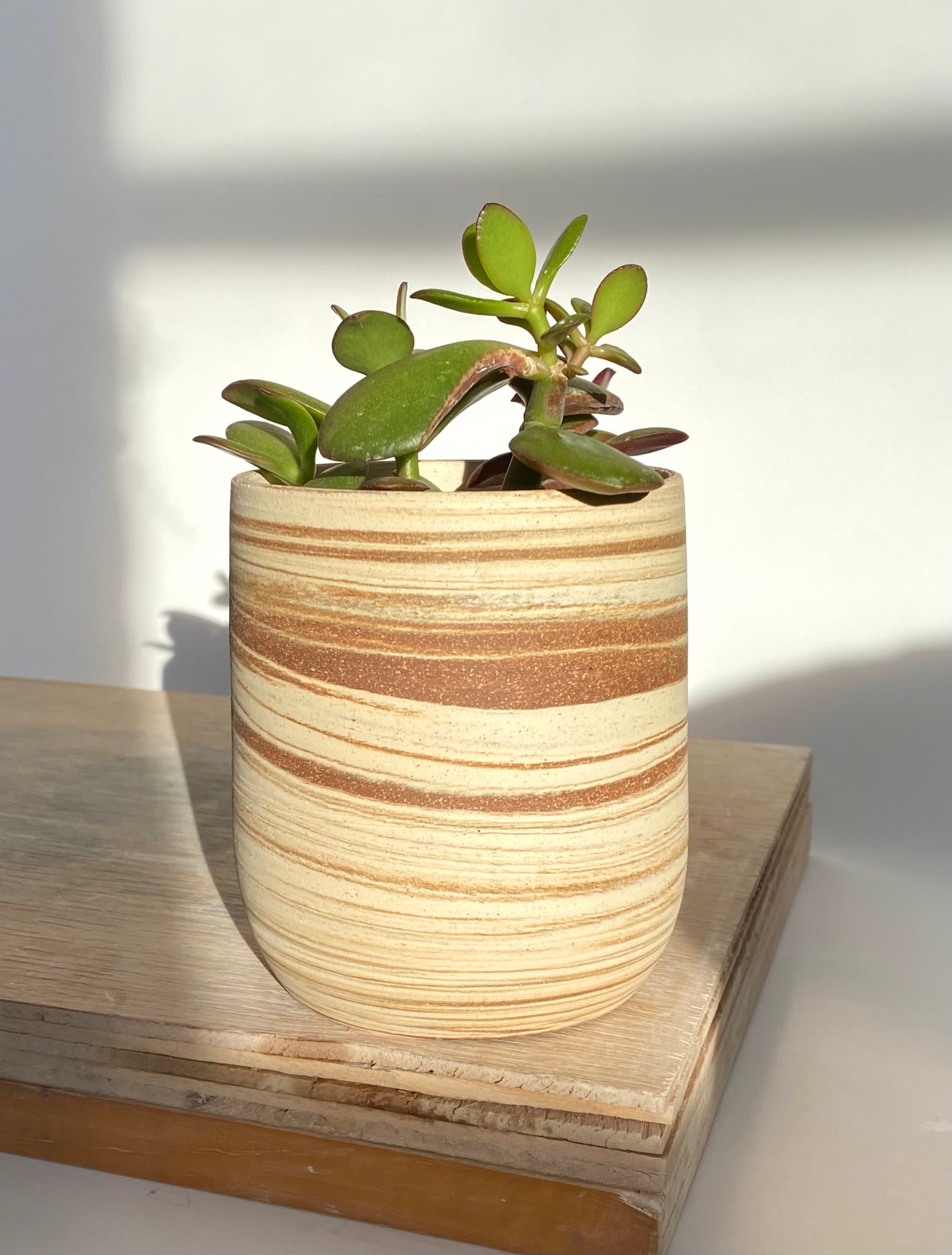 This small wheel-thrown planter features a rich swirl of natural clays, with Brooklyn Red as the standout tone. Its smooth, cylindrical form shows off striking marbling in warm rust and cream layers, highlighting the natural beauty of the clay bodies used. Left unglazed on the outside for a raw, earthy finish, it’s perfect for succulents, small plants, or as a sculptural accent on its own.
