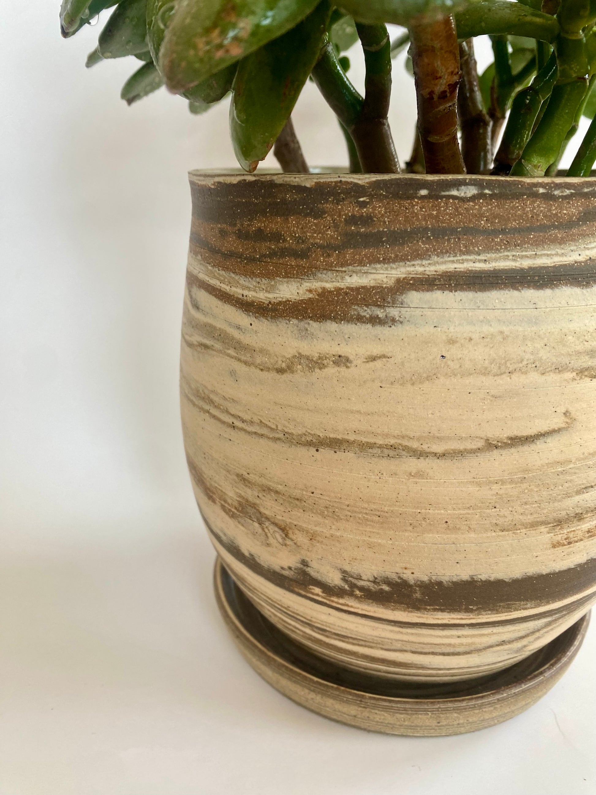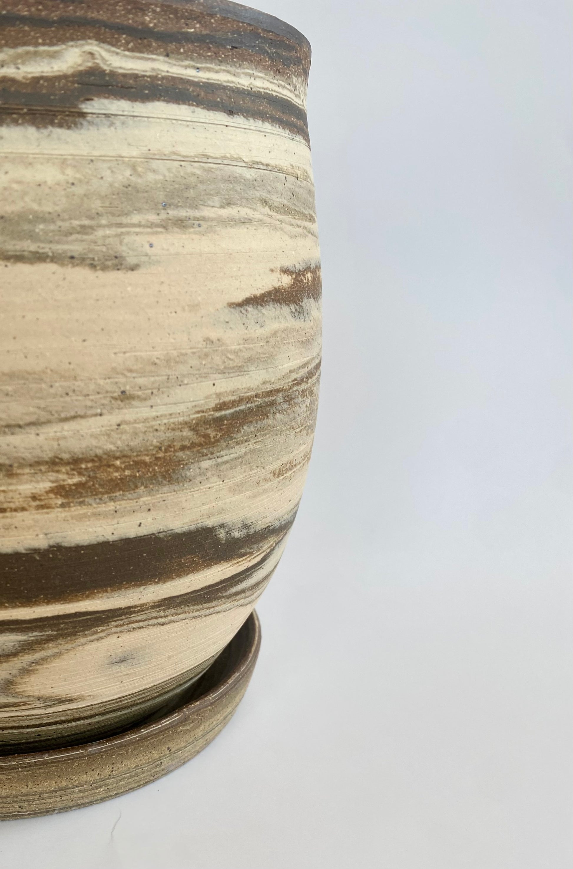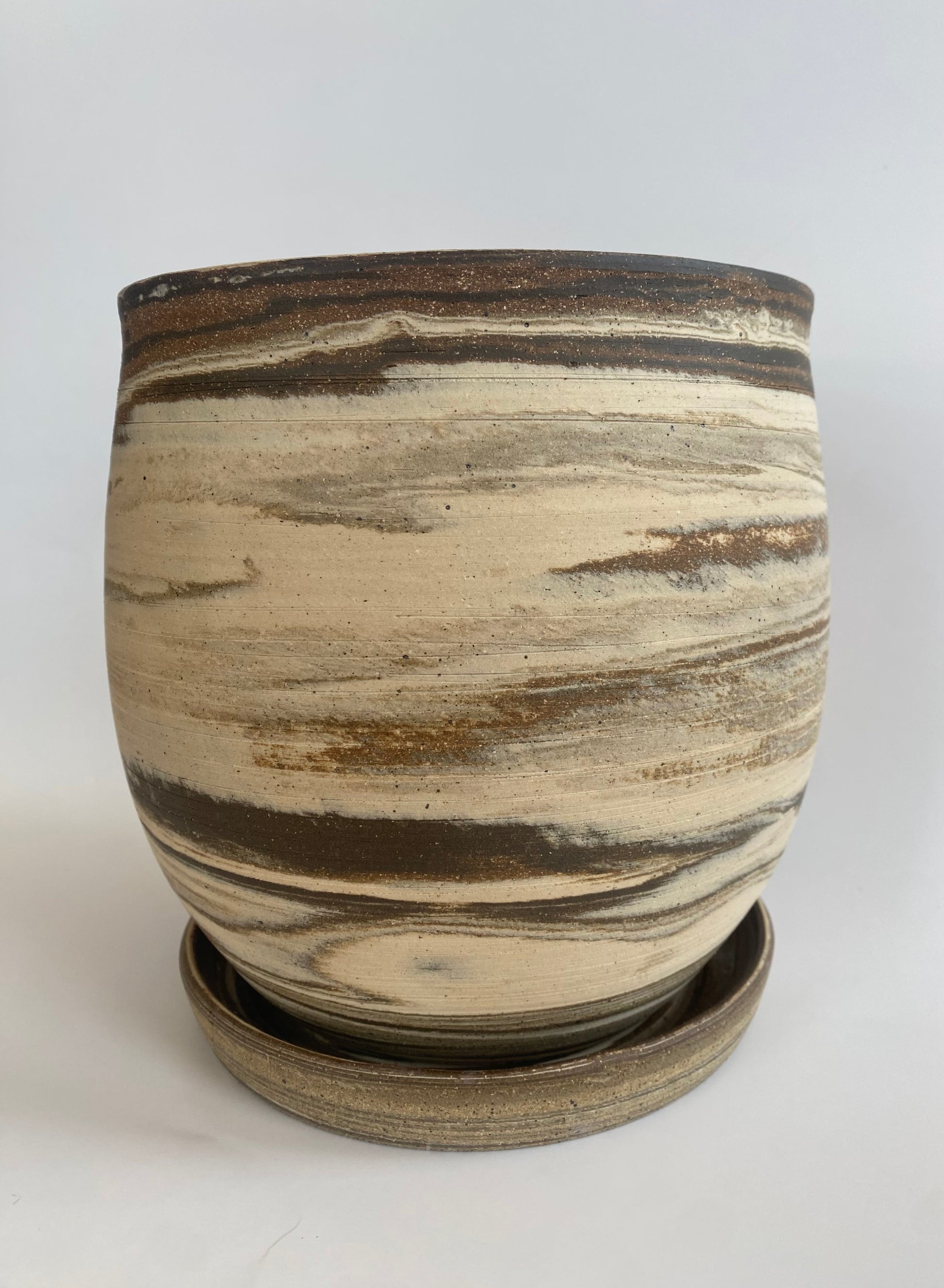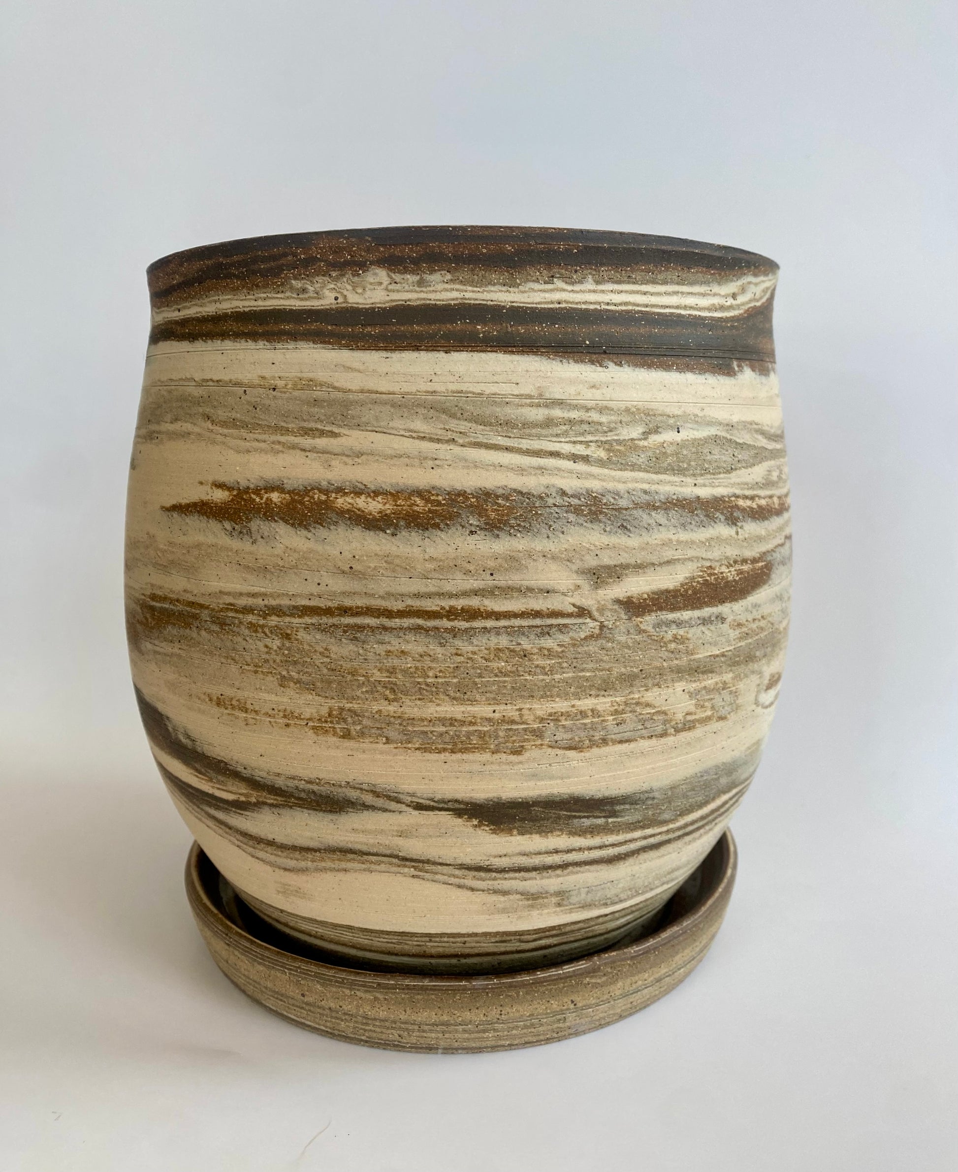 The planter was crafted using four different clay bodies, giving it a unique marbled surface with warm, natural striations. The rim carries a slight organic warp, a detail that reflects the handmade character of the piece.