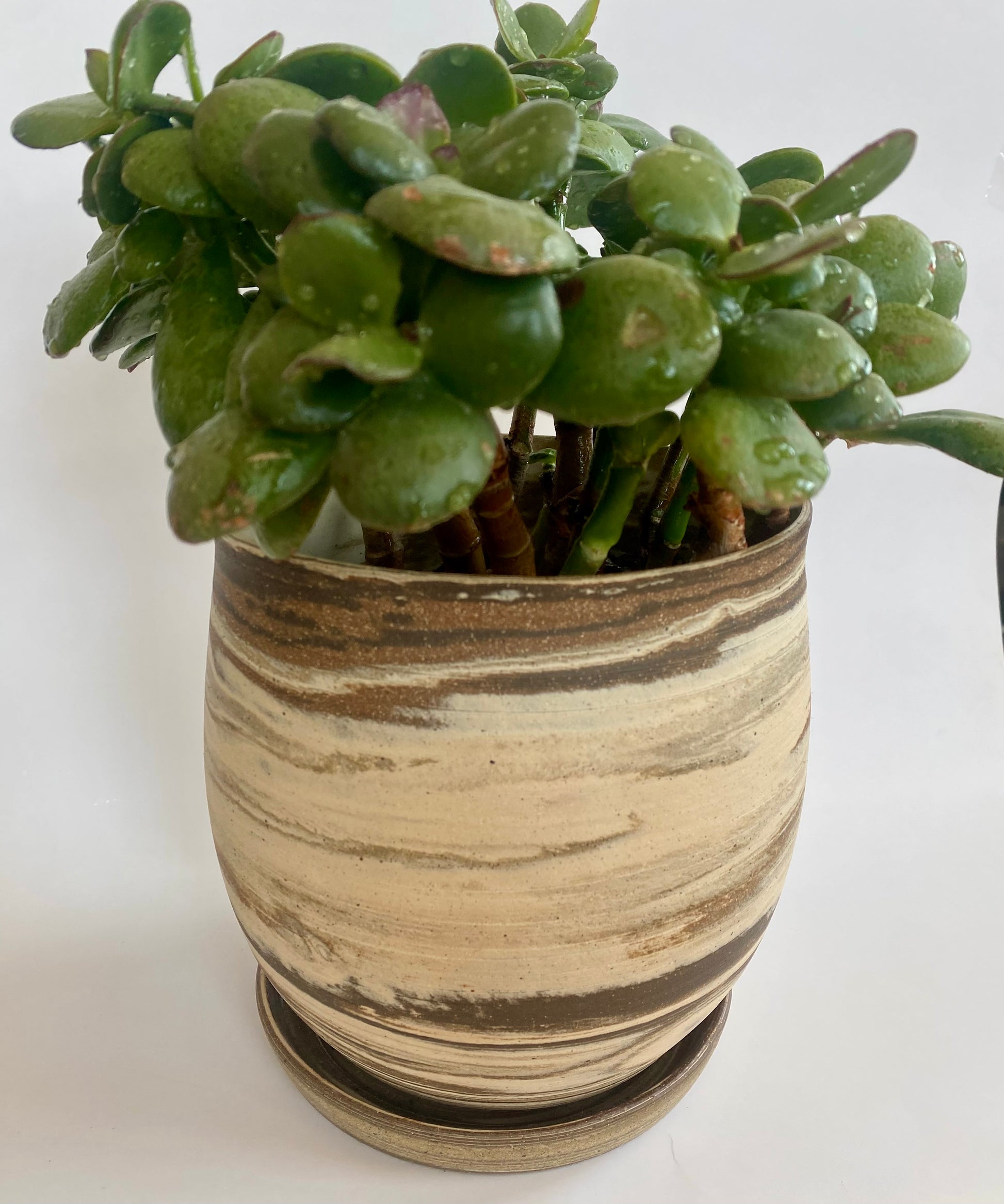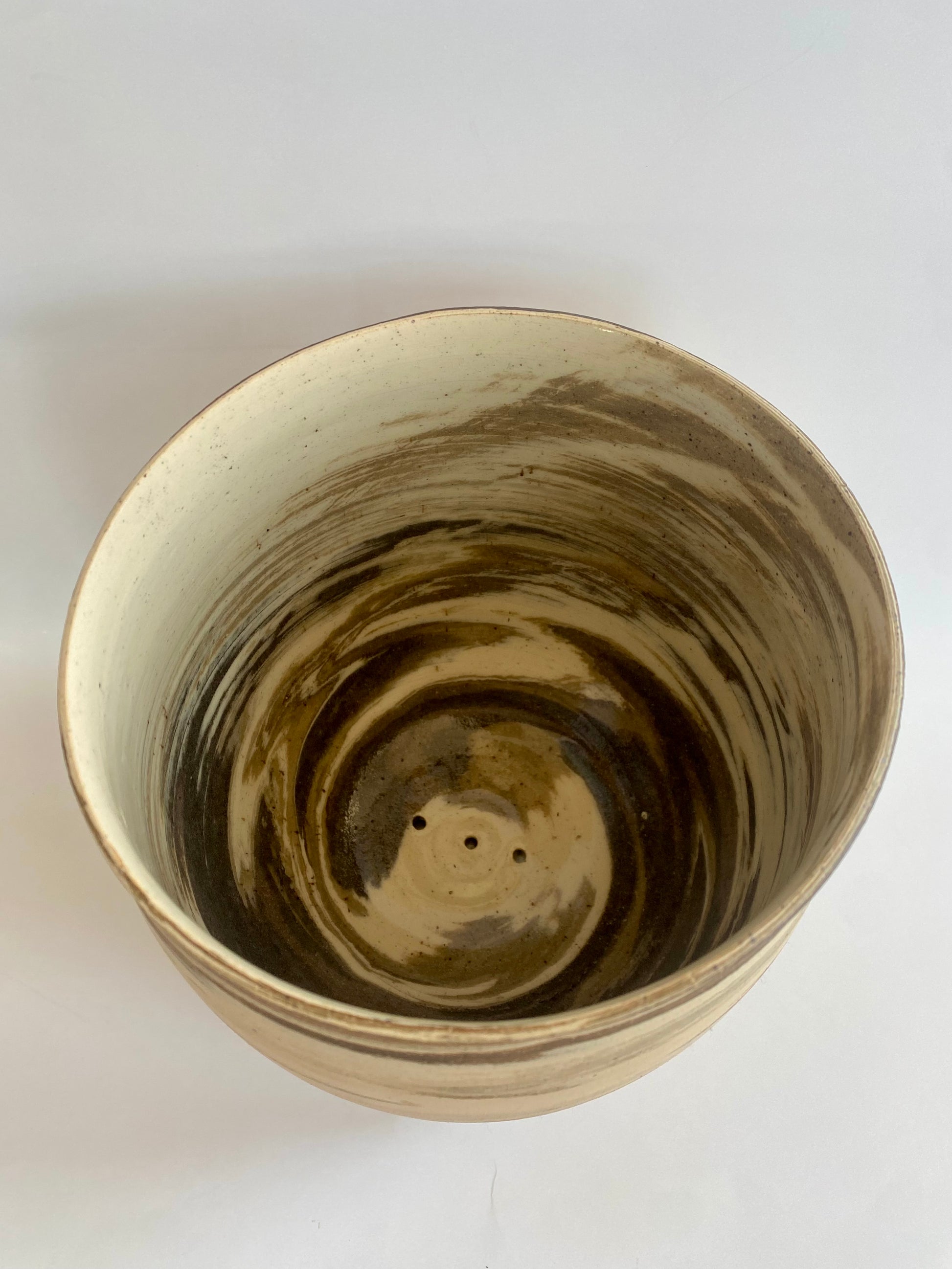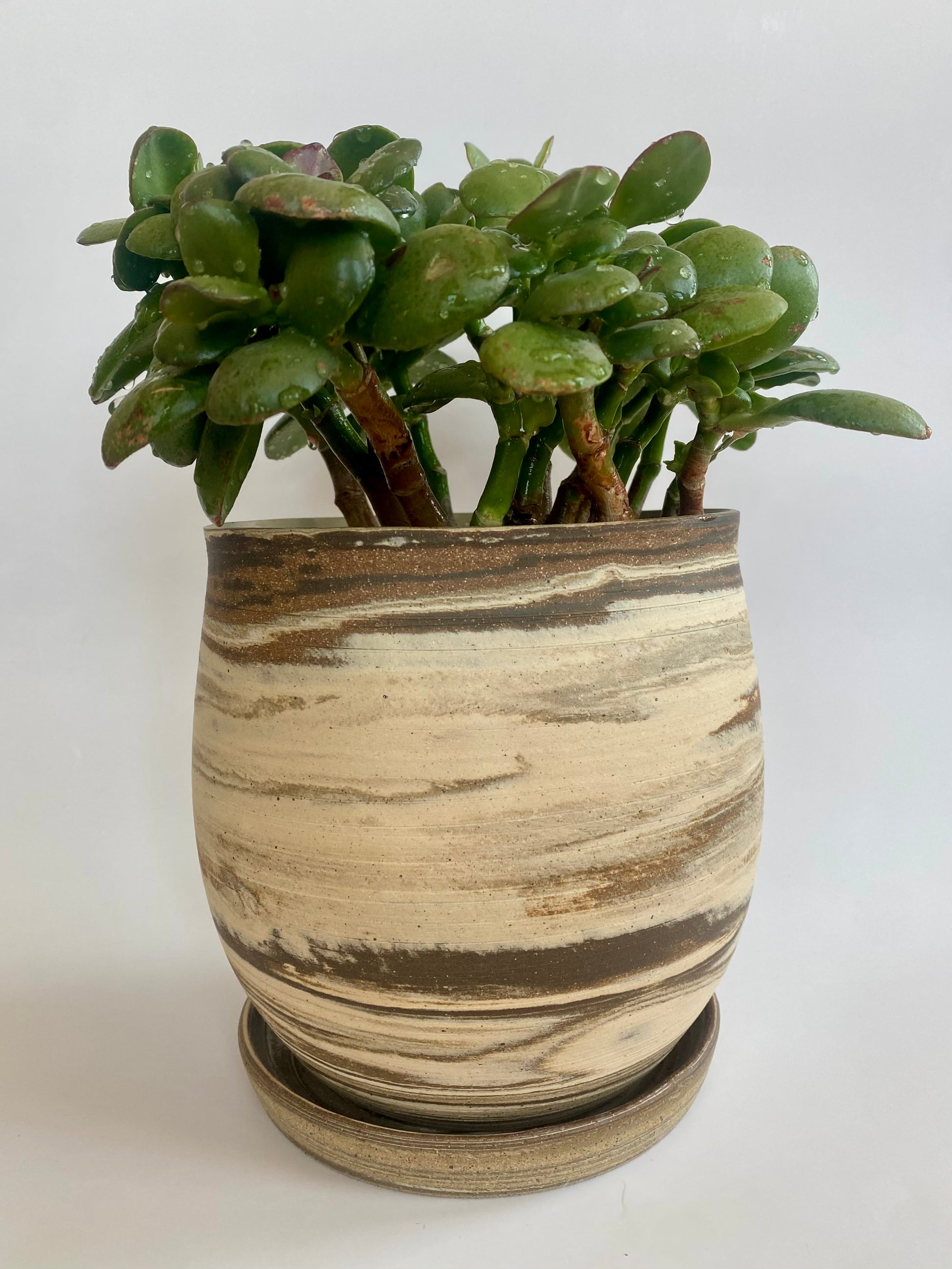 The planter was crafted using four different clay bodies, giving it a unique marbled surface with warm, natural striations. The rim carries a slight organic warp, a detail that reflects the handmade character of the piece.