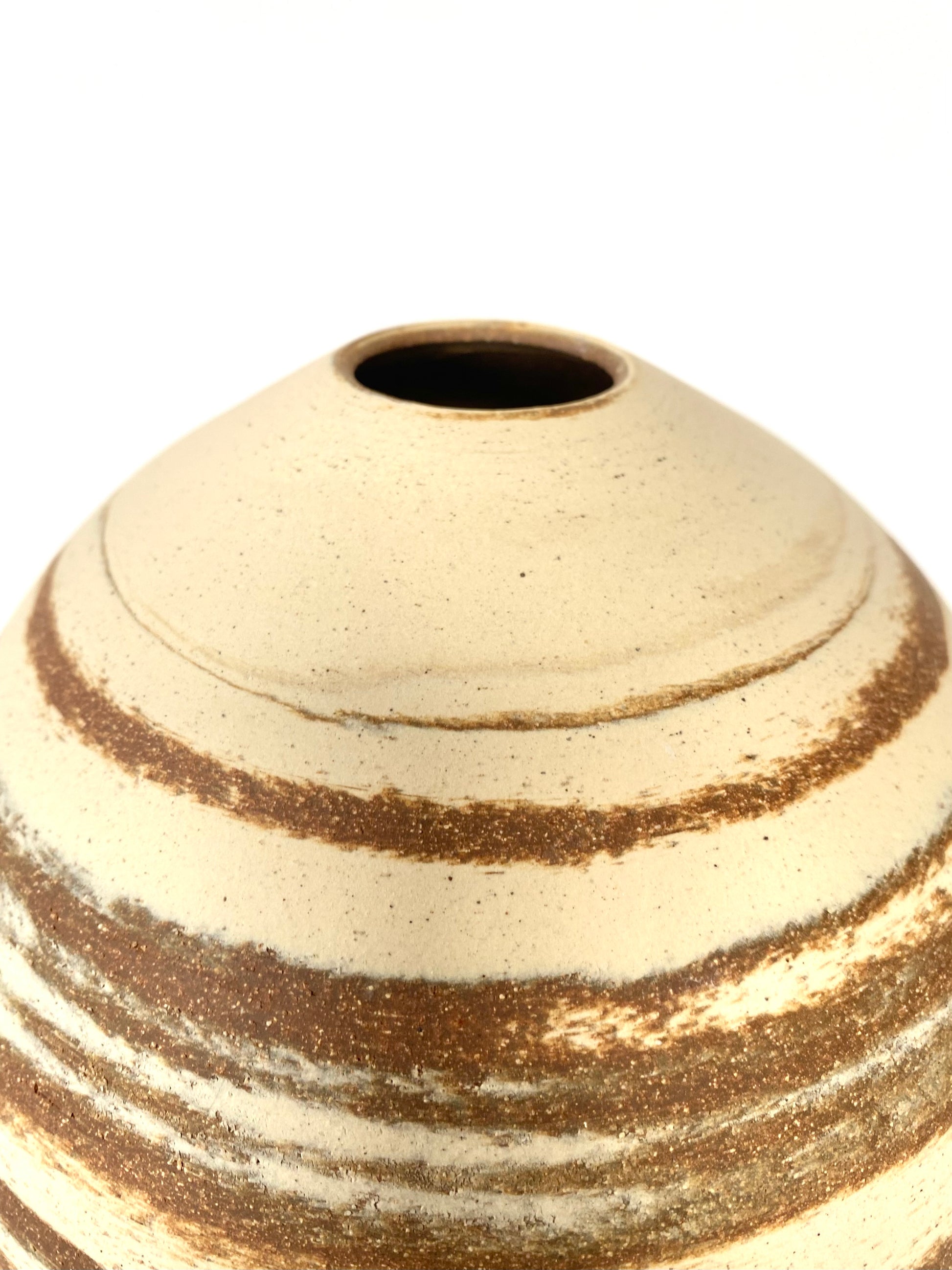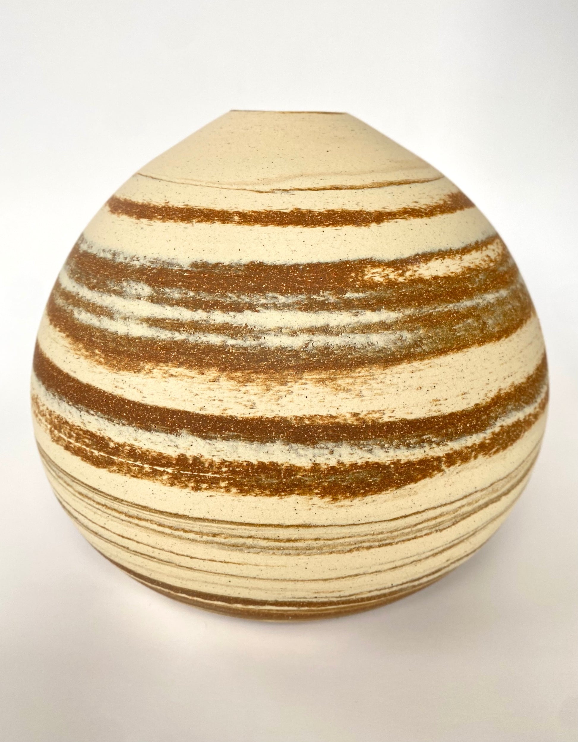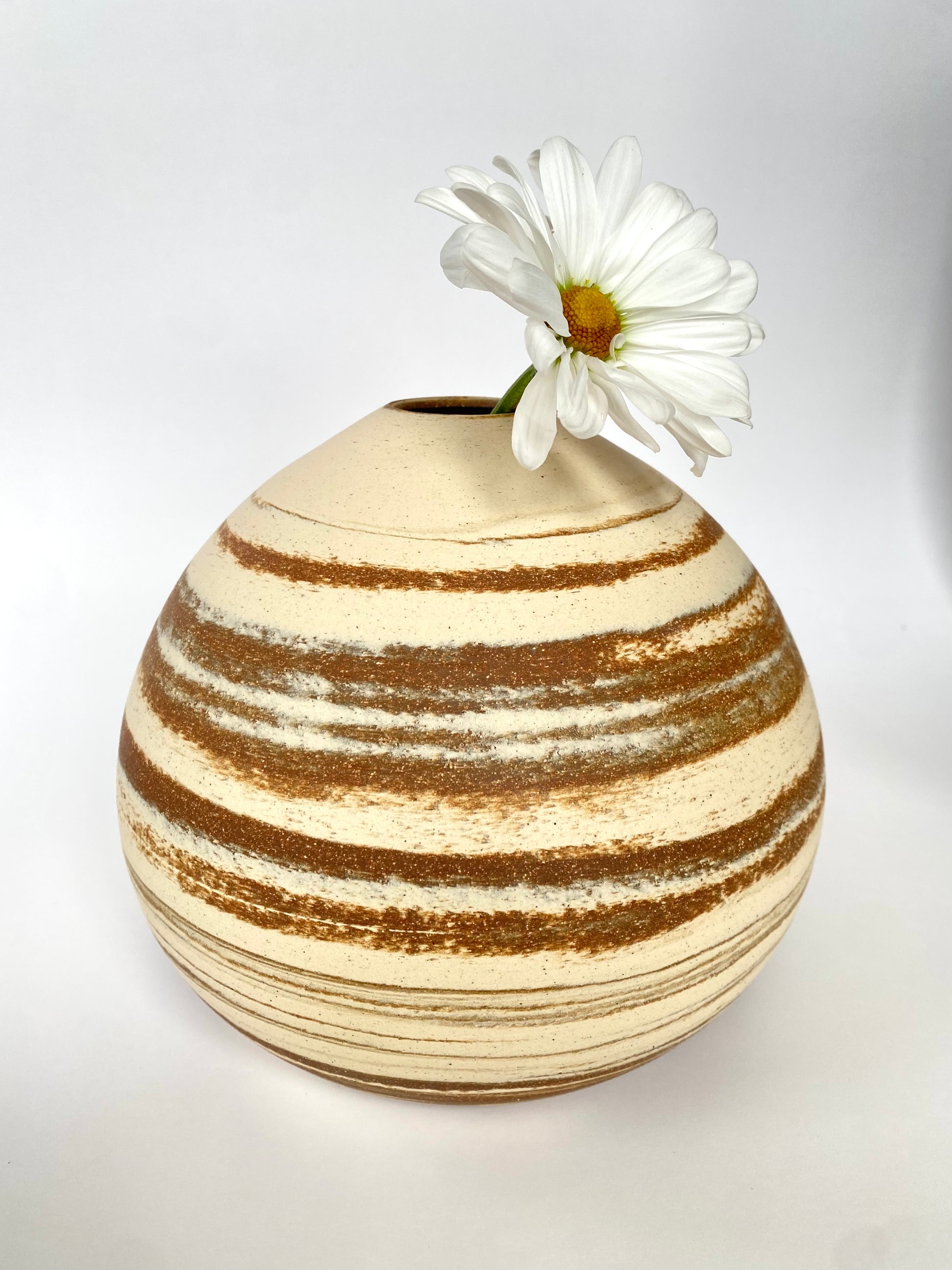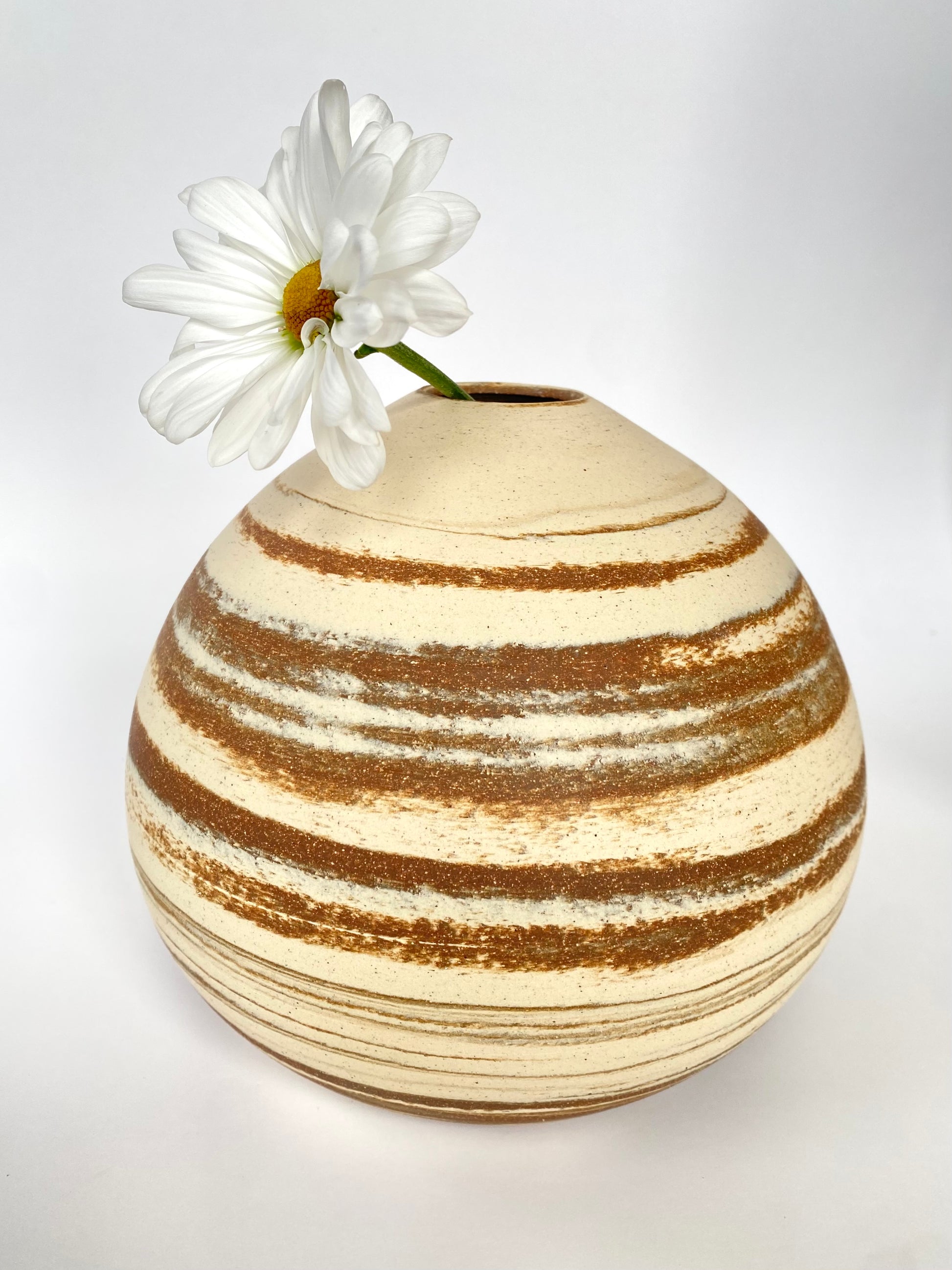 This one-of-a-kind piece was hand-thrown using a blend of natural stoneware clays, including a rich clay body called Brooklyn Red. The marbled bands in soft cream, sandy beige, and warm reddish-brown swirl gently around the form, creating a natural, earthy pattern. Its round curves and narrow opening give it a sculptural, minimalist feel.