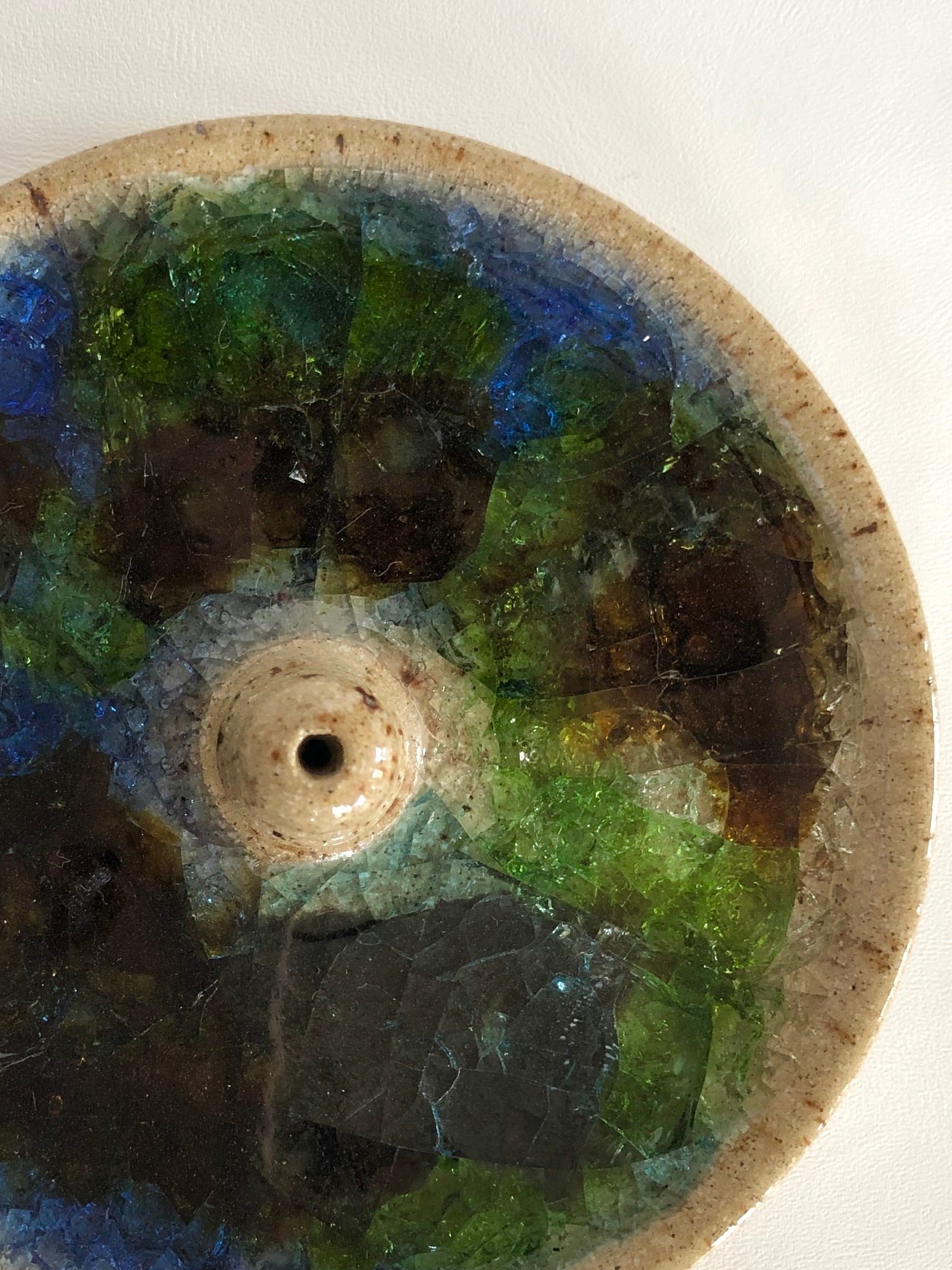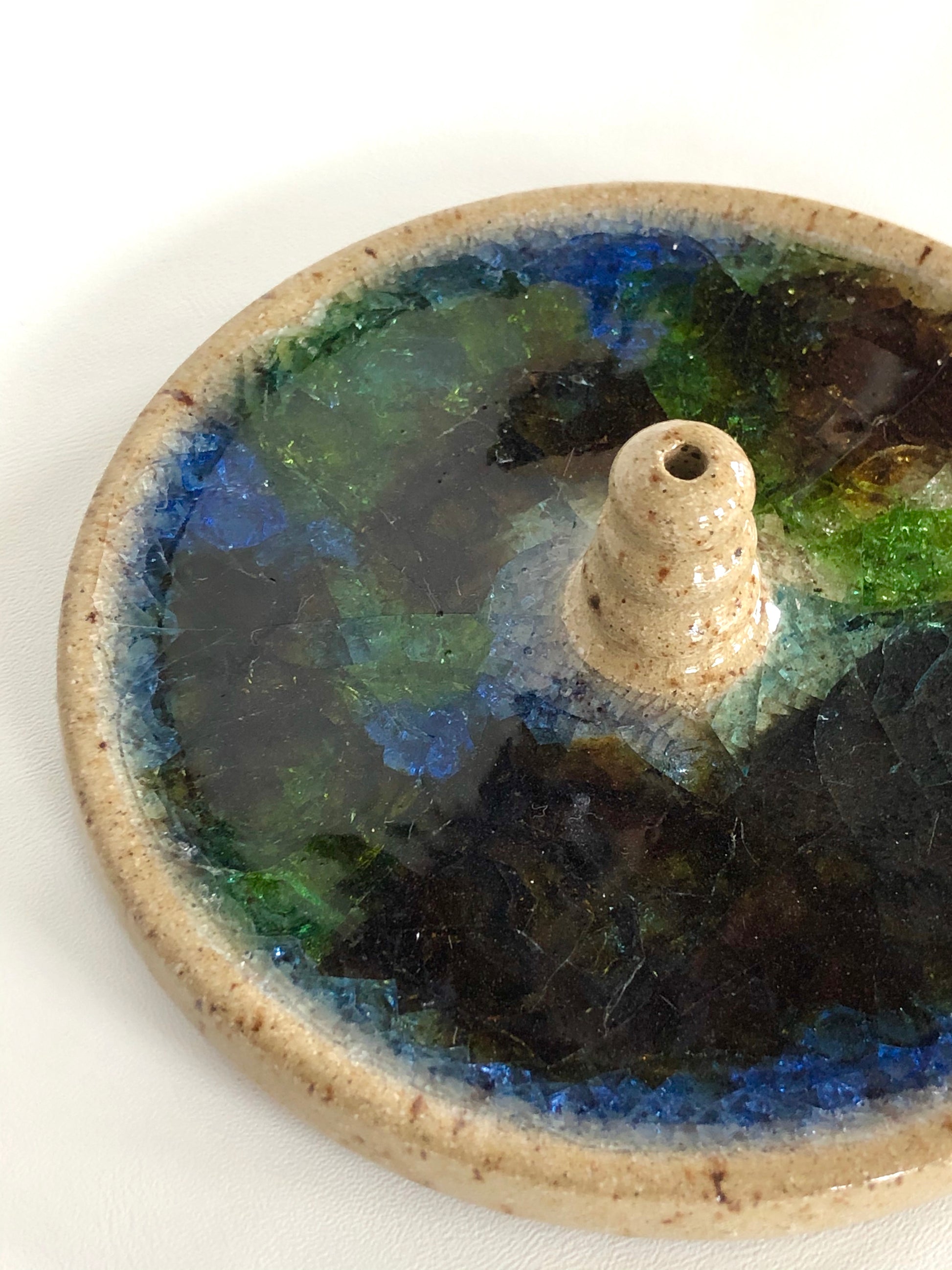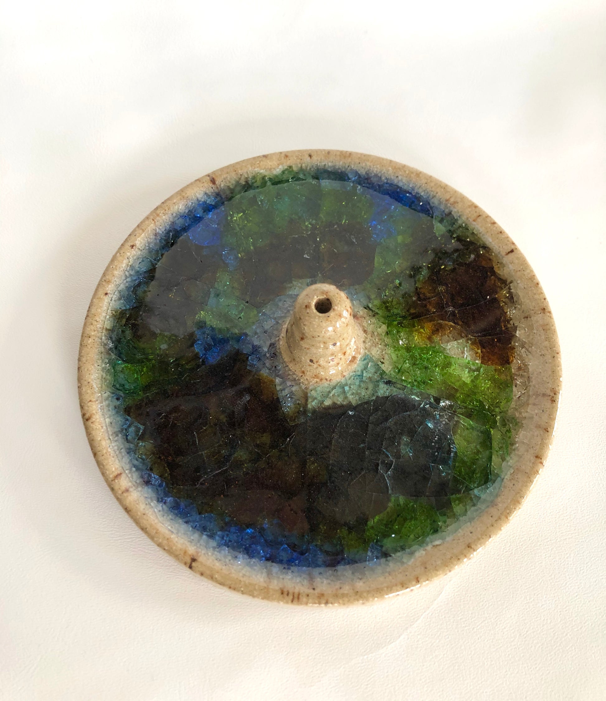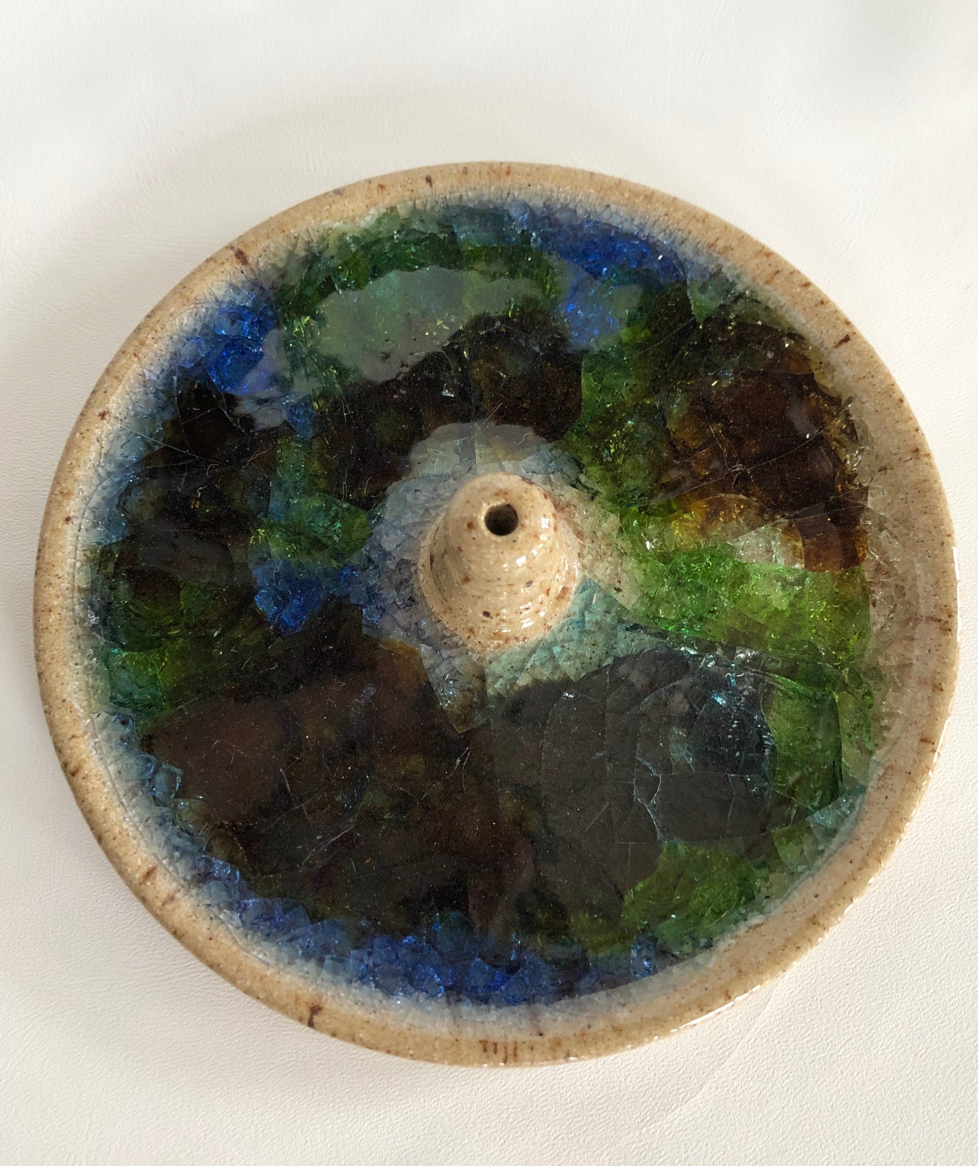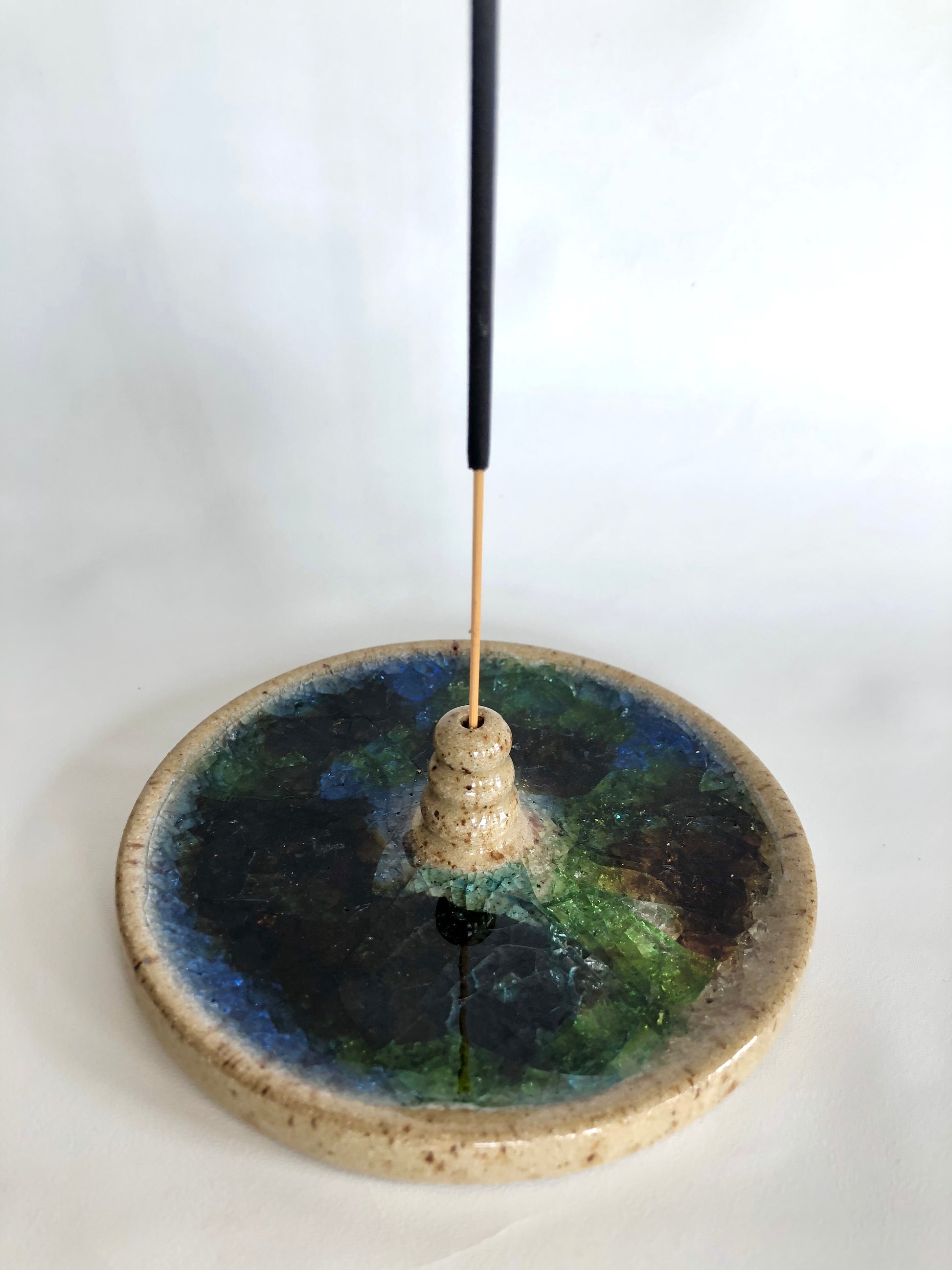 This incense holder has a simple, urban style, made with tan clay and colorful melted glass. It's perfect for bringing a relaxed vibe to any modern space. The combination of earthy brown with splashes of blue and green makes it both stylish and functional.