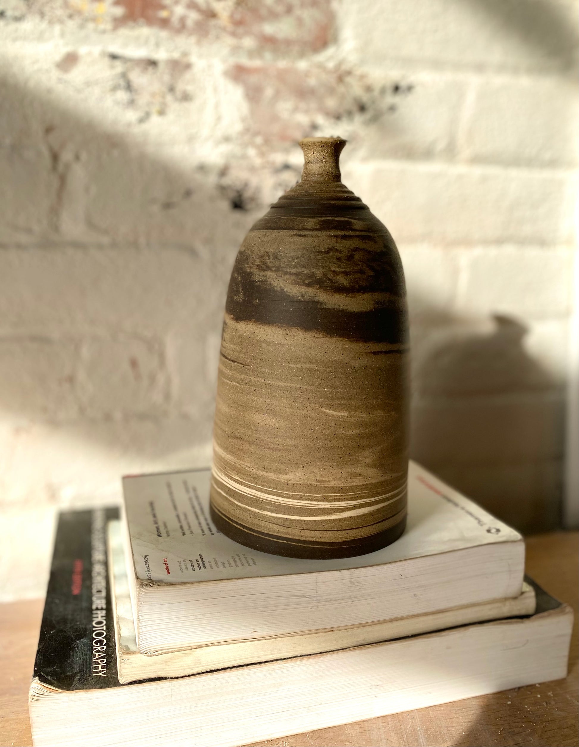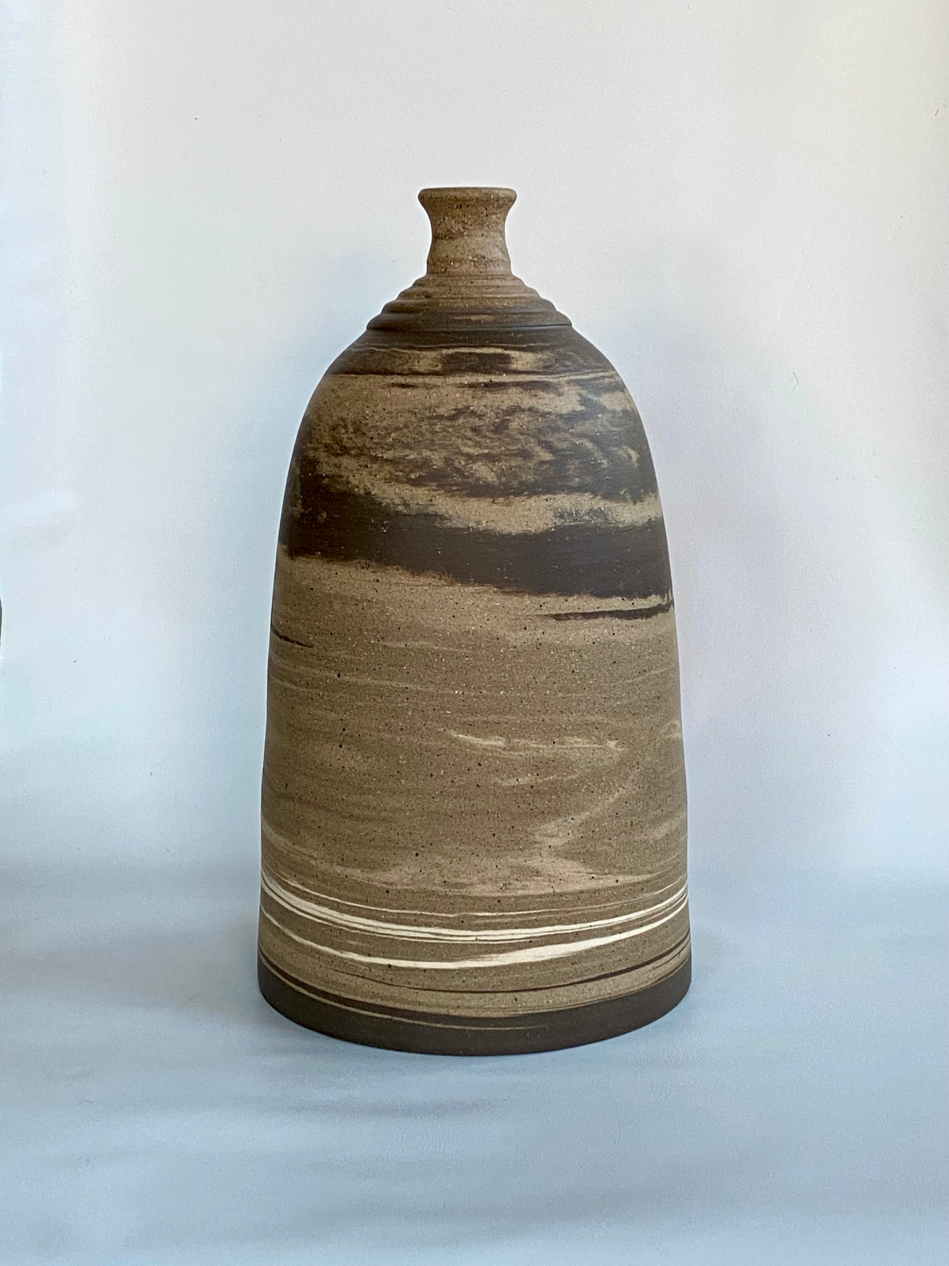 This striking bottle vase is hand-thrown using three different stoneware clay bodies, creating dynamic marbling that flows like sediment through stone. With its sculpted neck and domed body, the form feels both ancient and modern. The unglazed finish highlights the raw, tactile quality of the clay, making this a standout piece for any space.