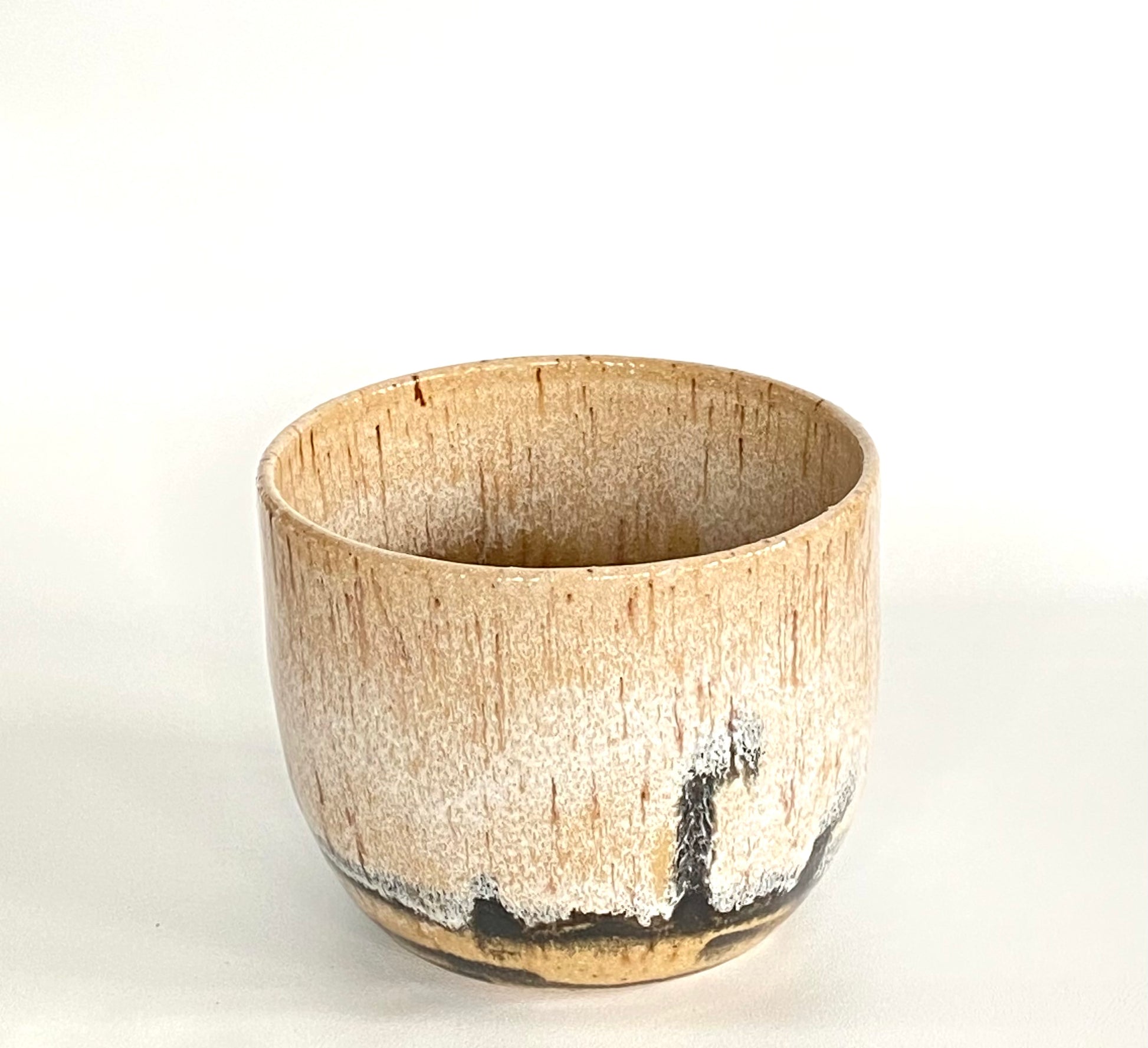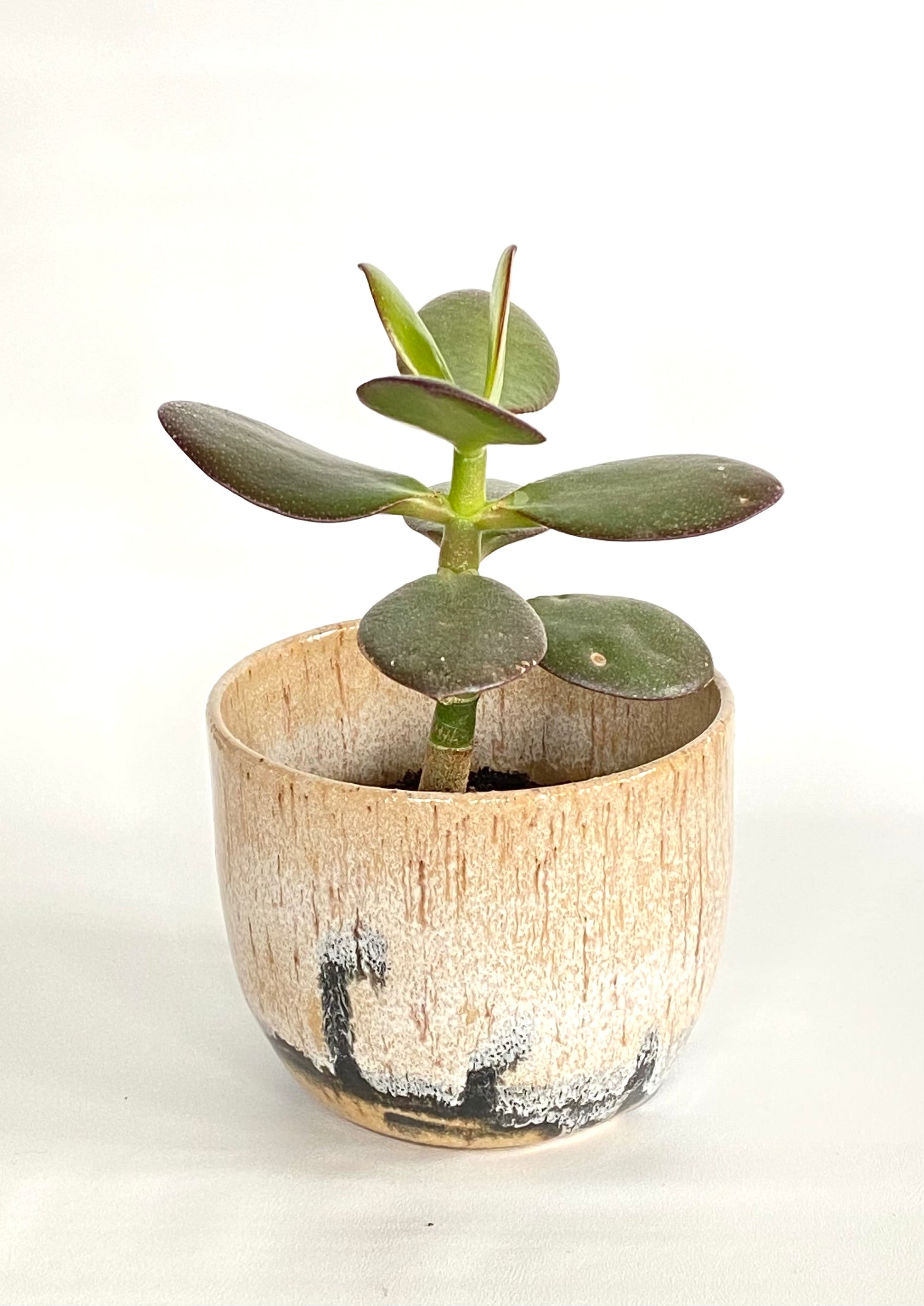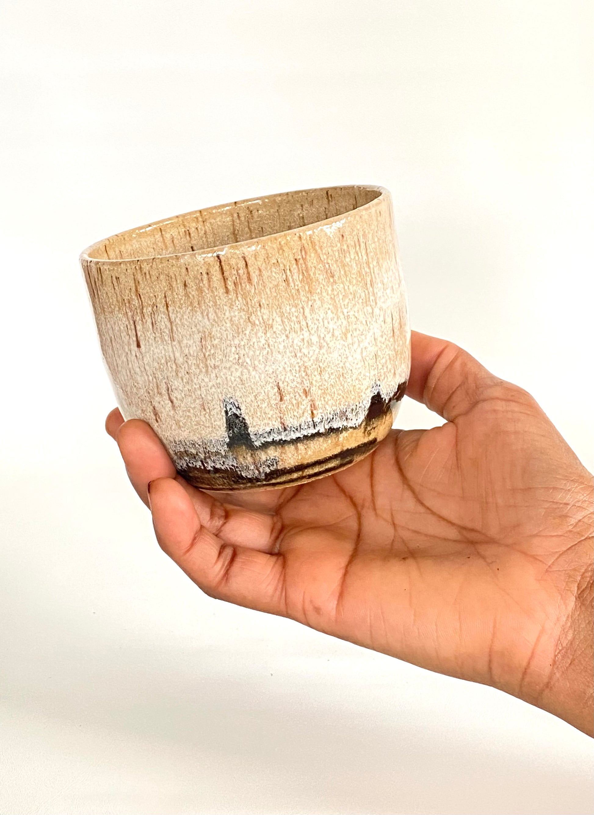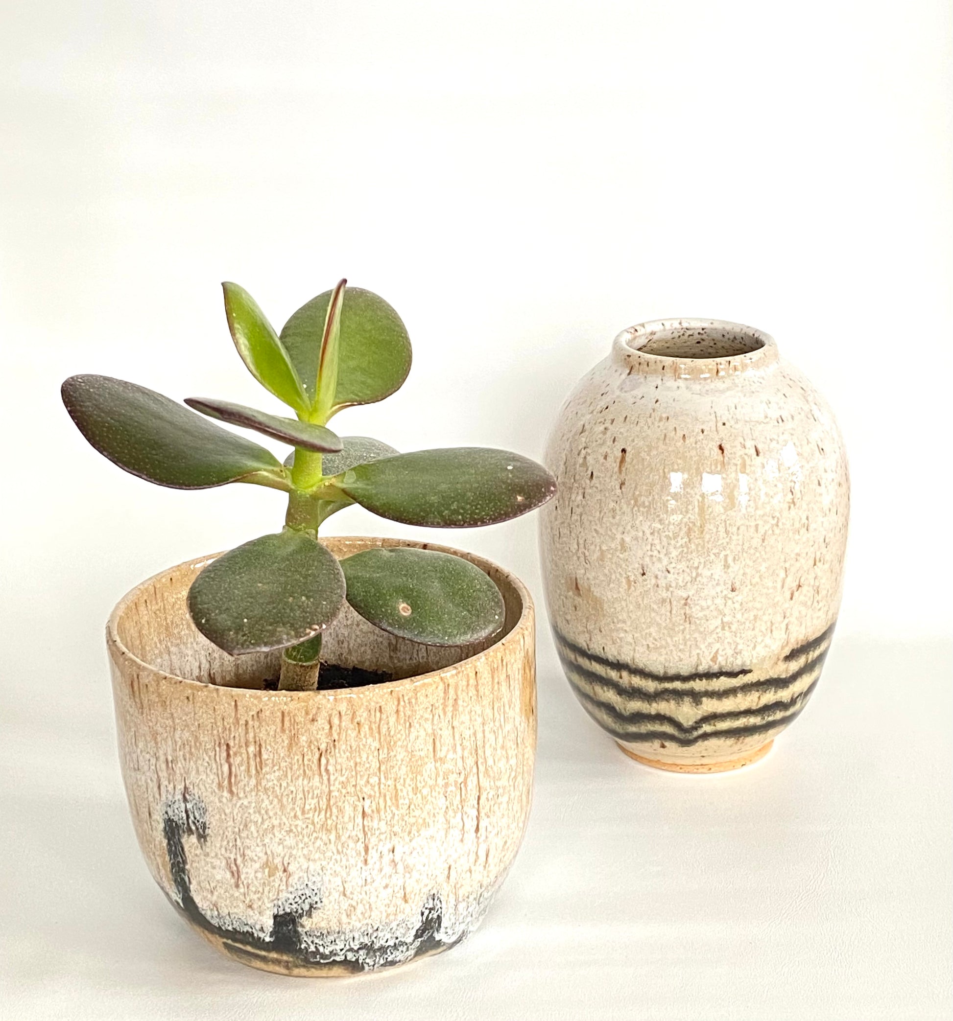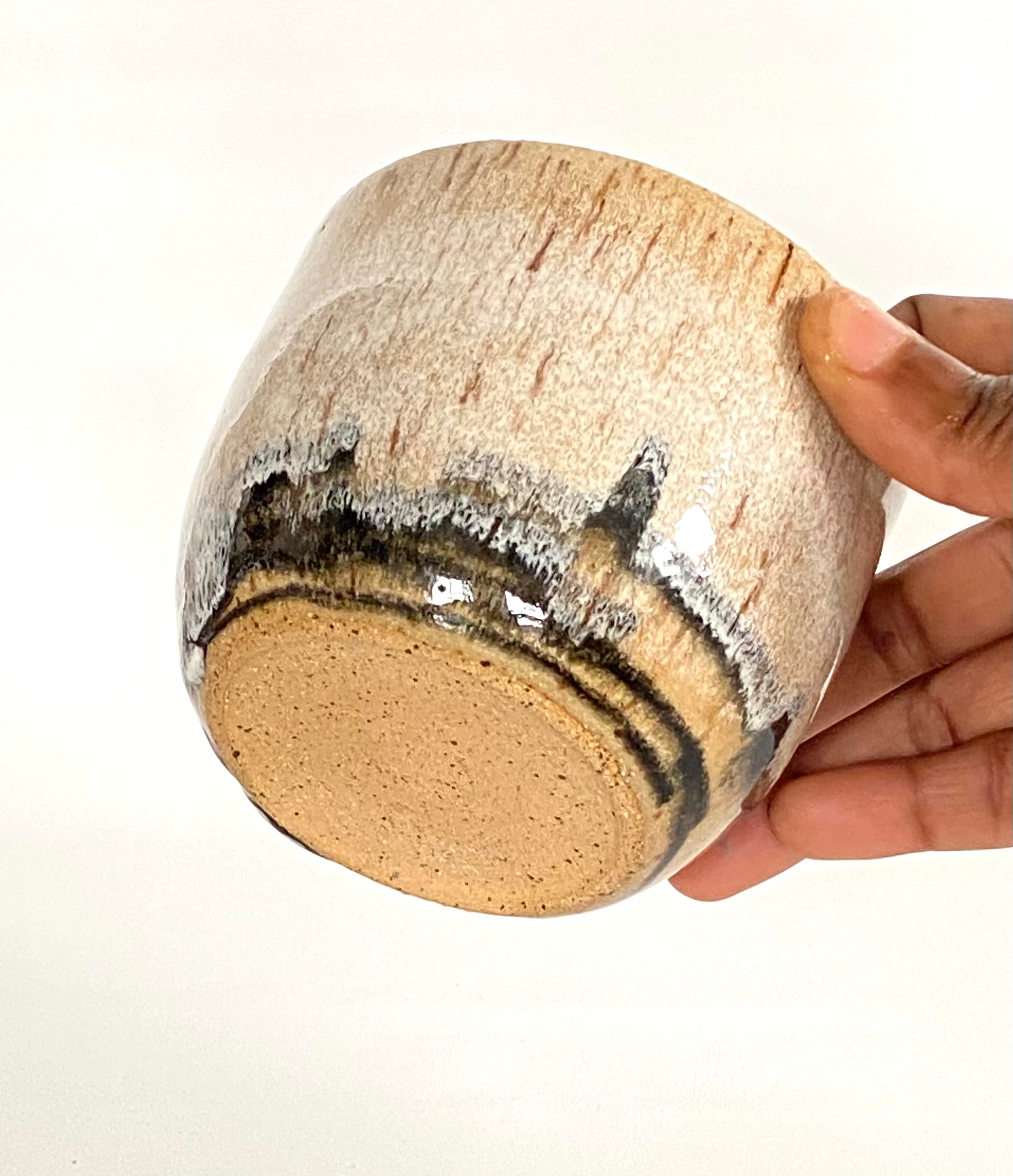 This hand-held planter boasts a natural, earth-inspired design. It's organic color palette of sandy beige and rich browns, accented by black brushstrokes, gives it an artisanal look. Ideal for cradling a small plant, or simply used as a small cup since there is no drainage hole. Made with stoneware clay.