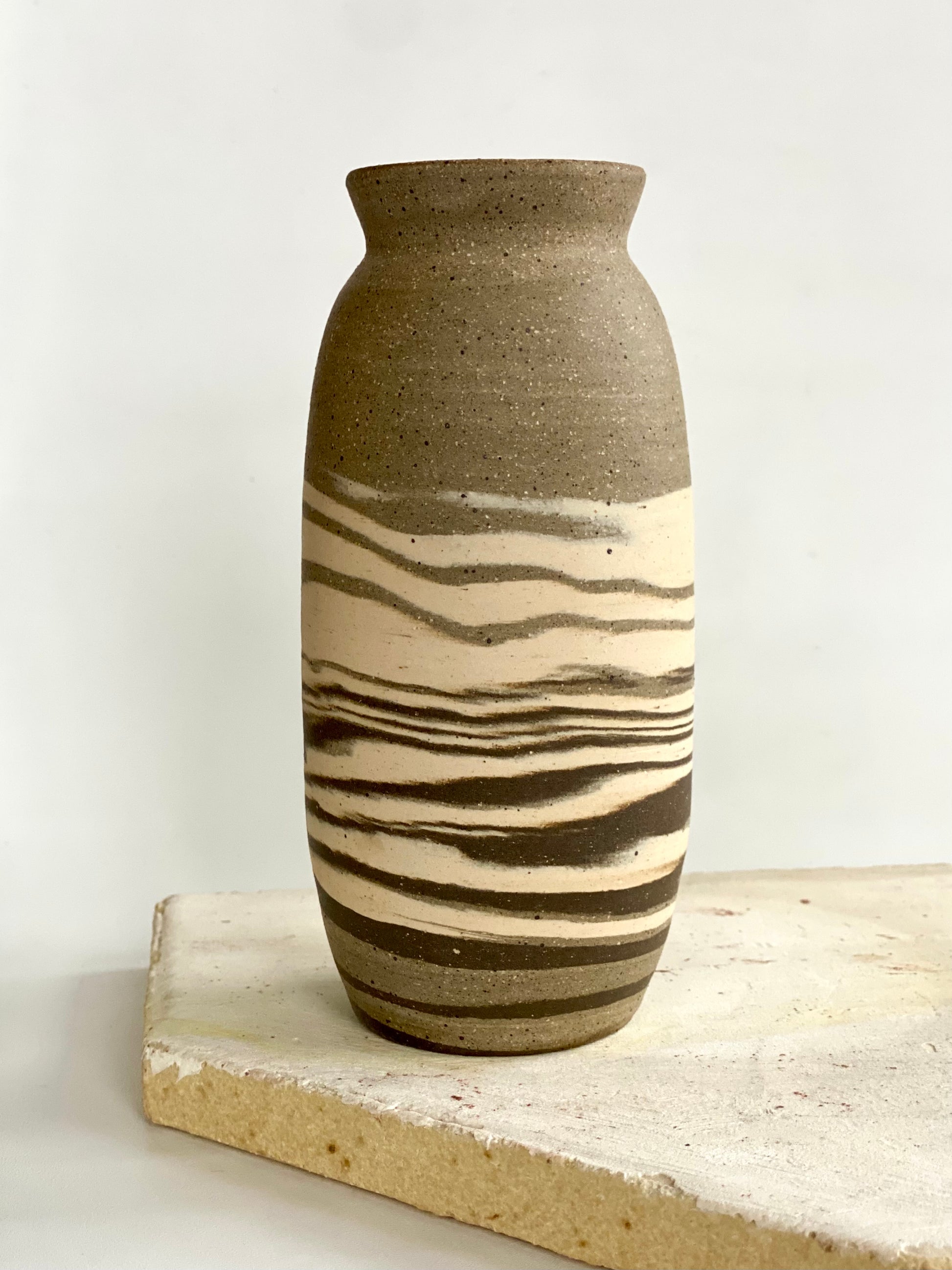 This hand-thrown vase is made from a blend of three stoneware clays, creating bold, layered marbling that wraps around the lower half. The gently flared neck gives it a graceful shape, while the unglazed finish lets the natural texture of the clay come through. A perfect piece for dried flowers or as a sculptural accent.