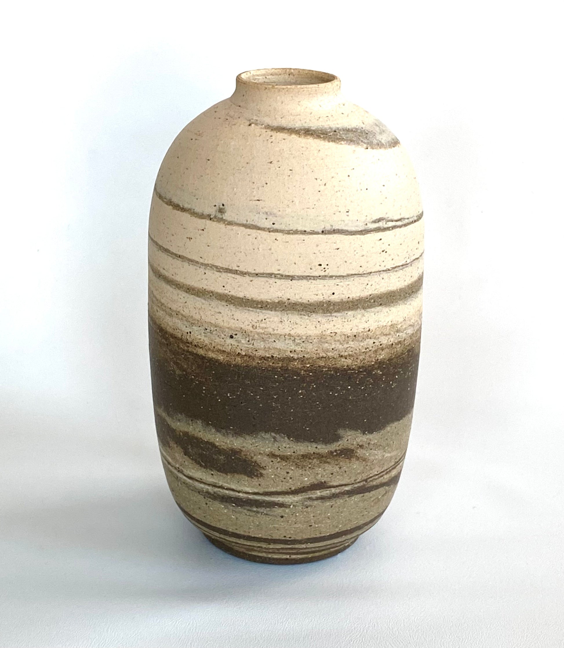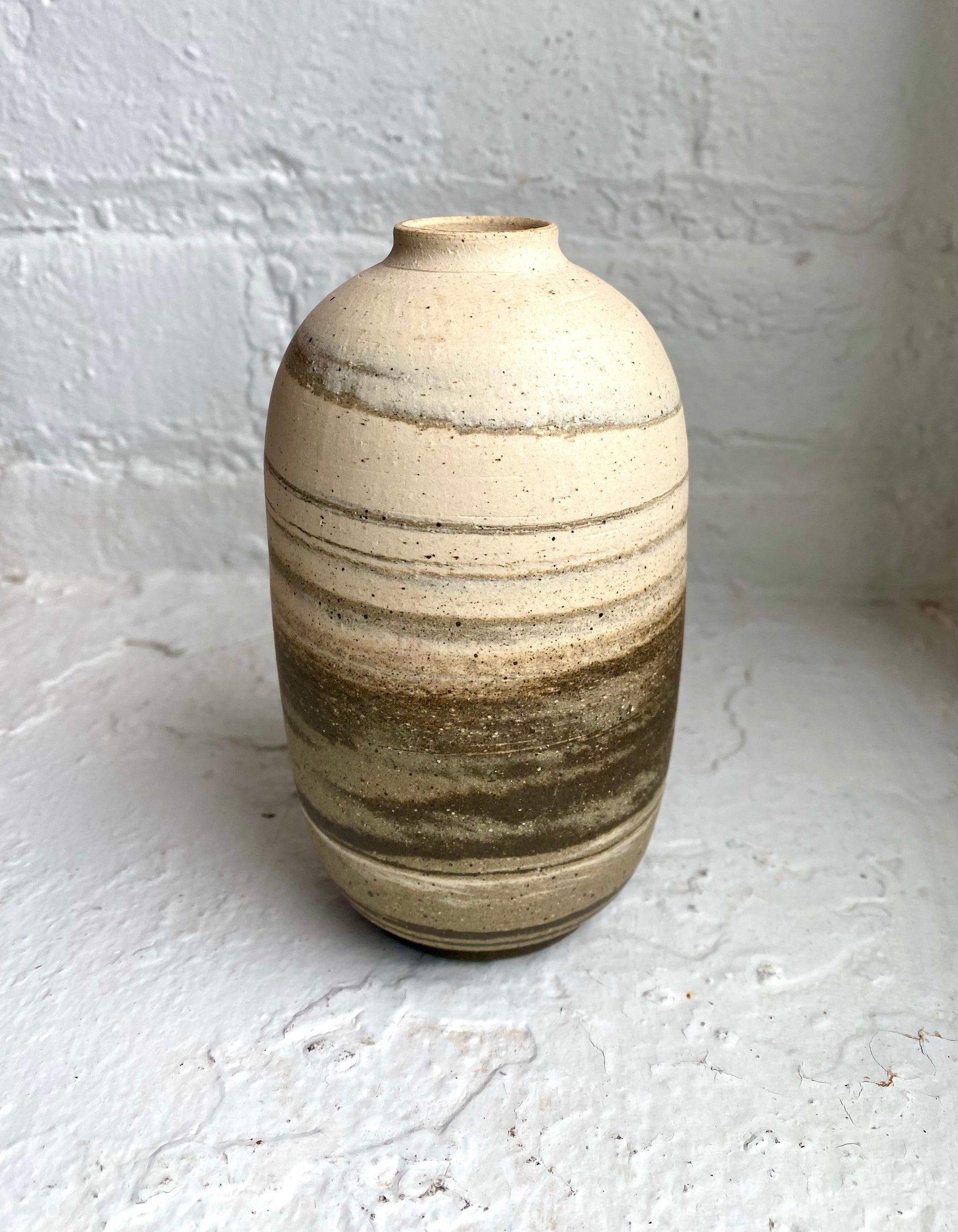 This small bottle-shaped vase is made from a mix of three stoneware clays, creating soft, layered marbling in natural earth tones. Its smooth curves and narrow opening give it a classic silhouette, while the unglazed finish lets the texture of the clay shine through. Perfect for dried stems or as a sculptural accent.