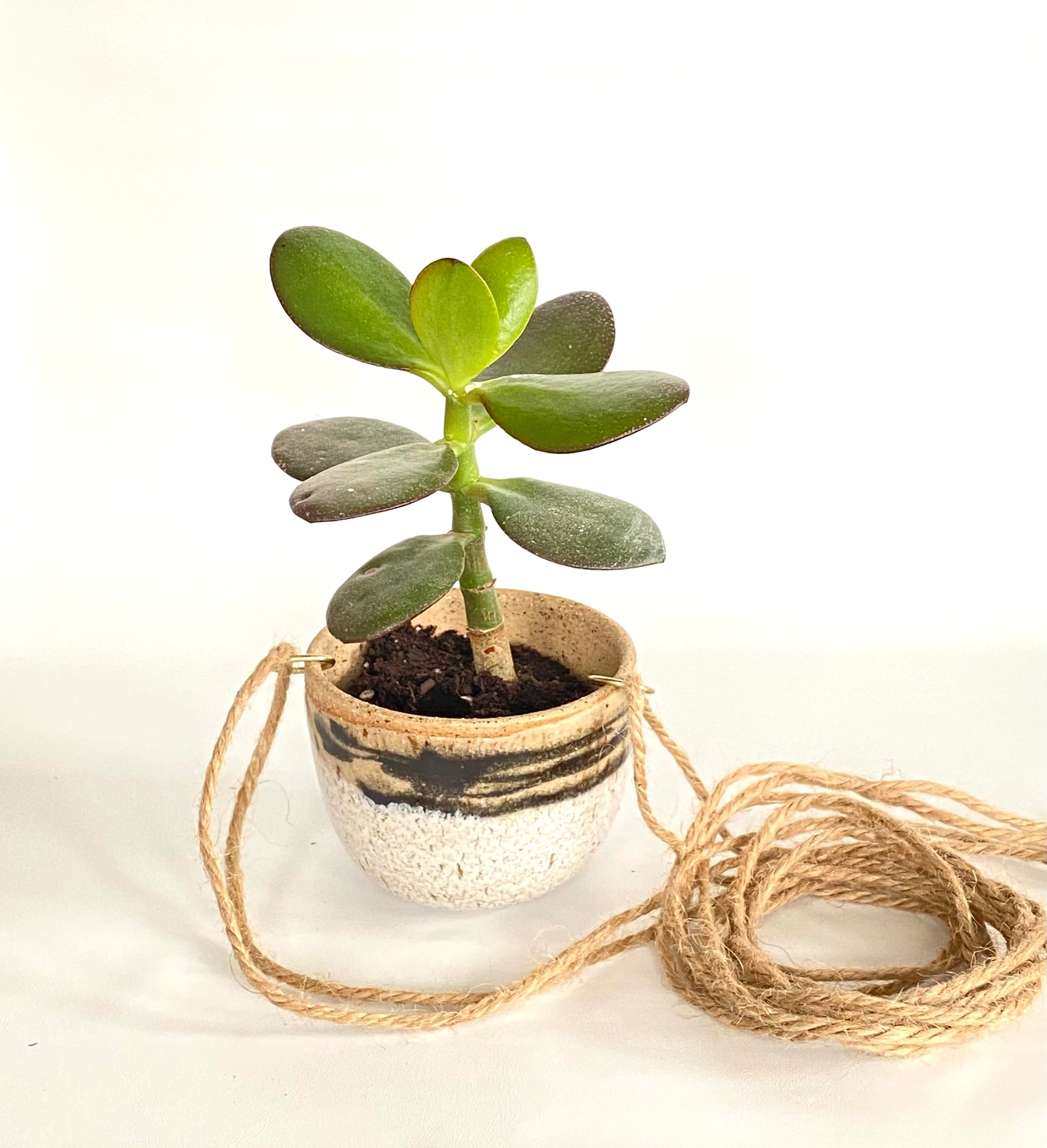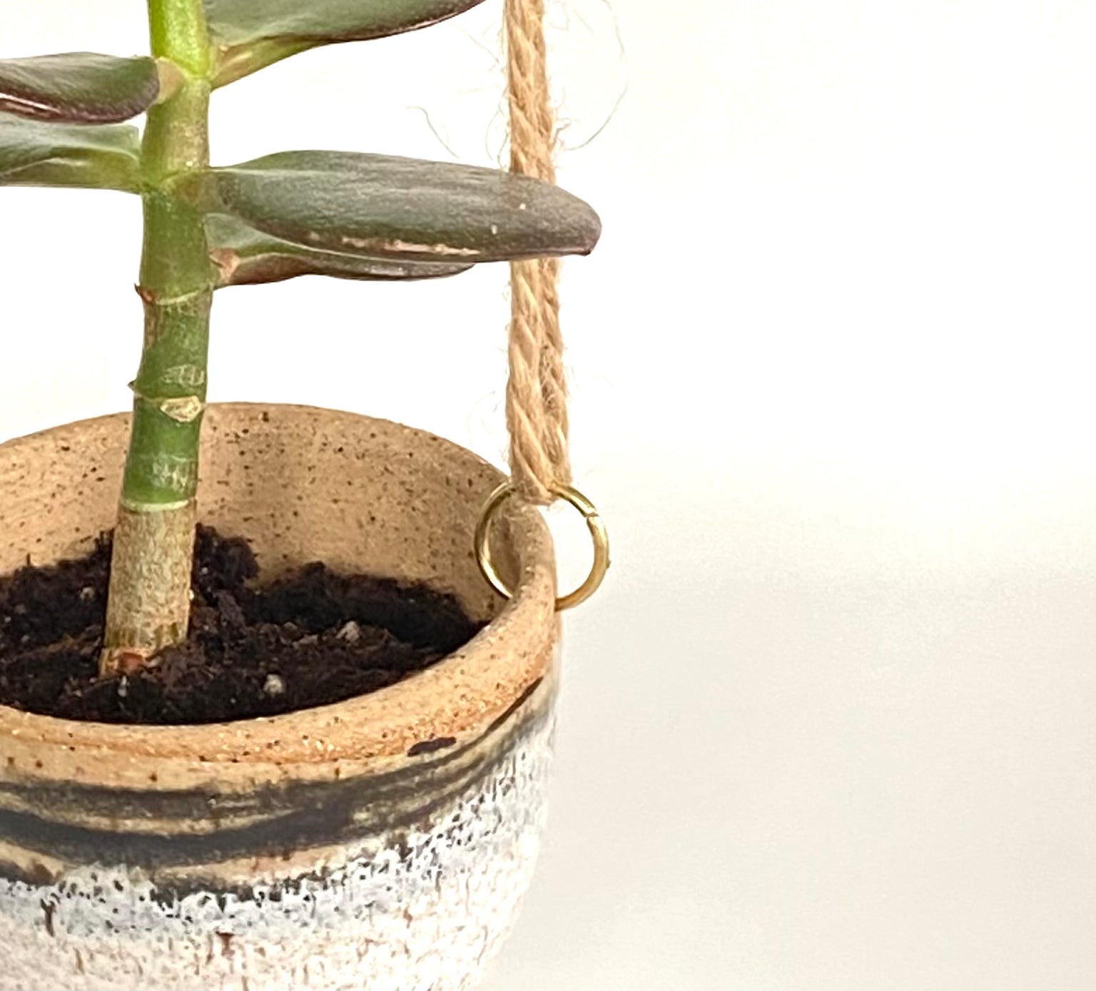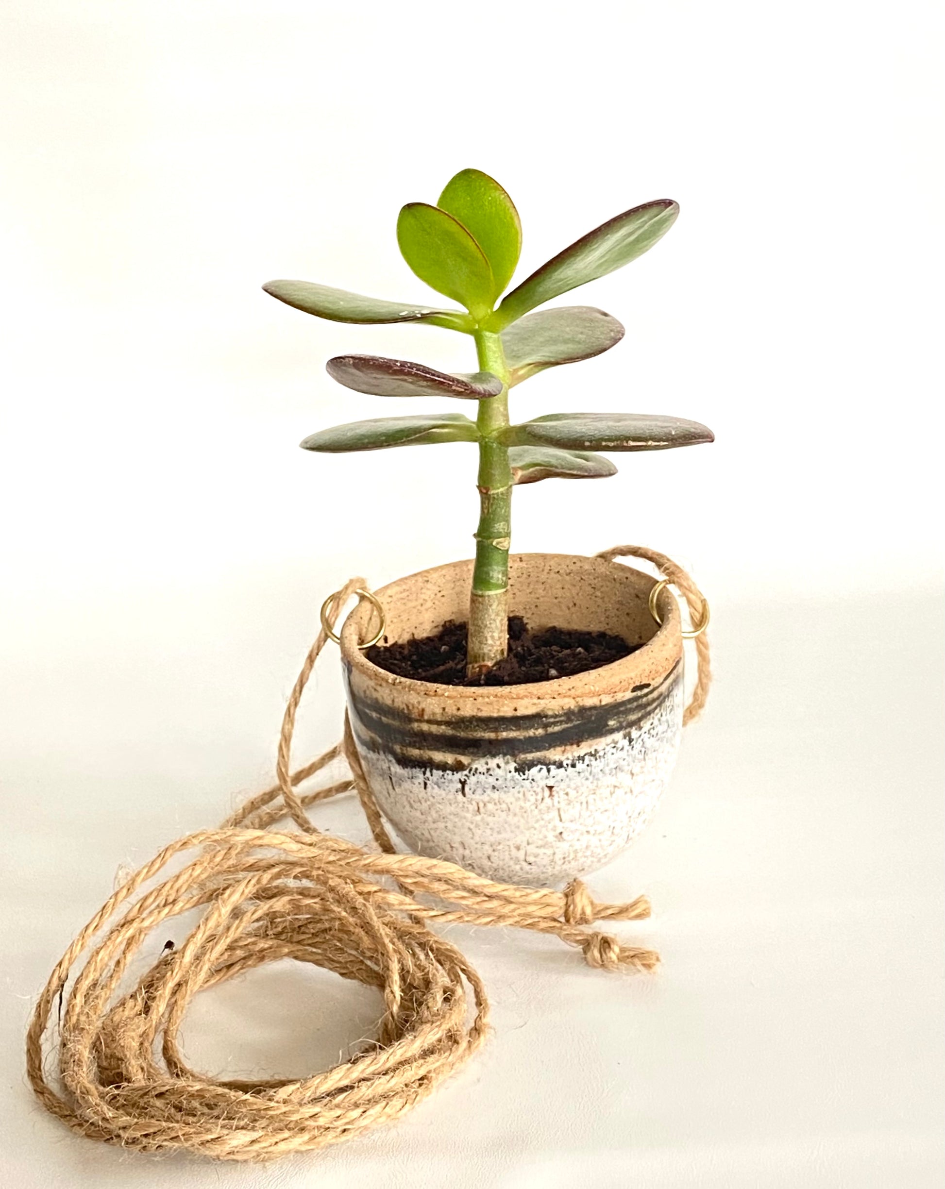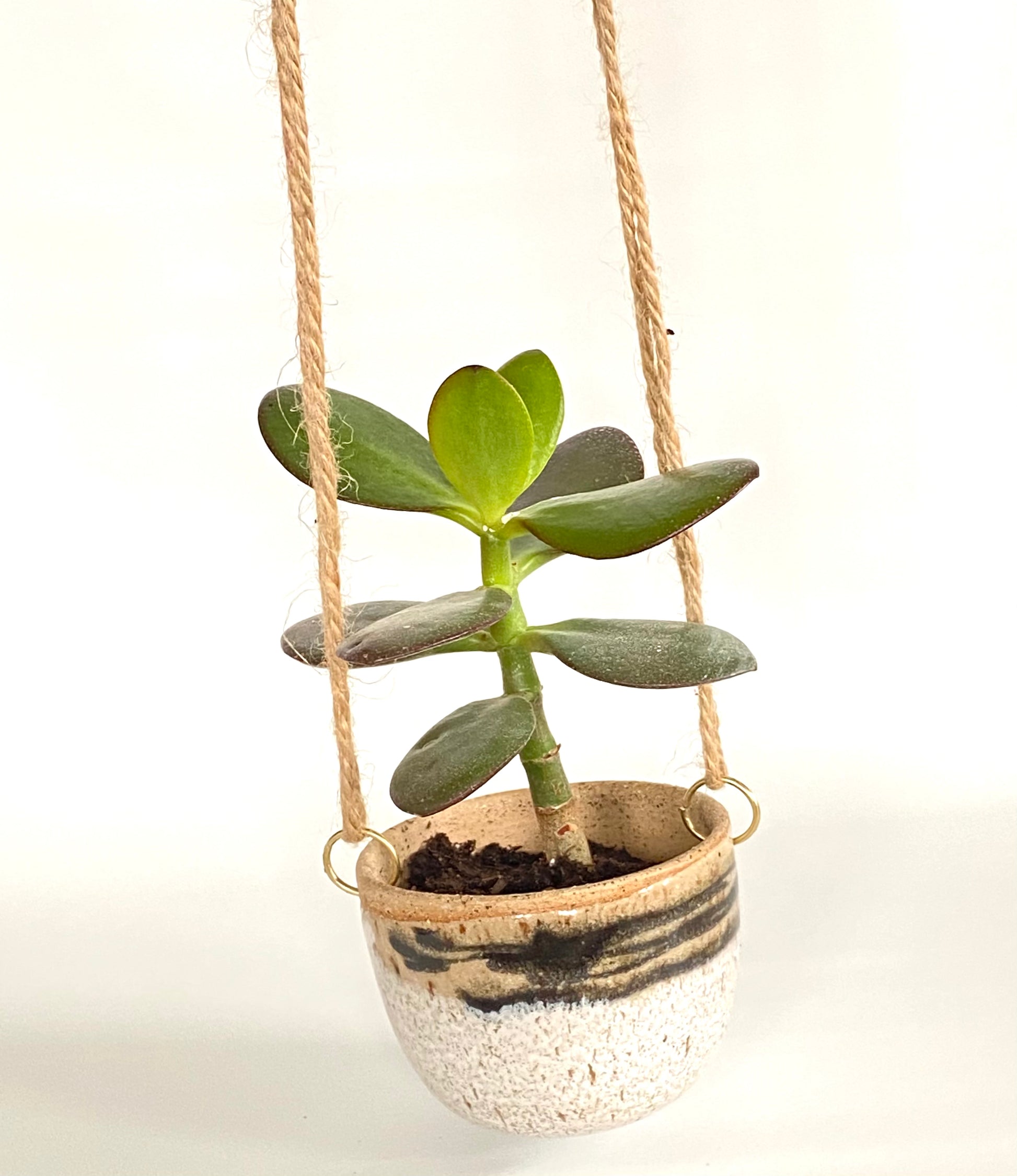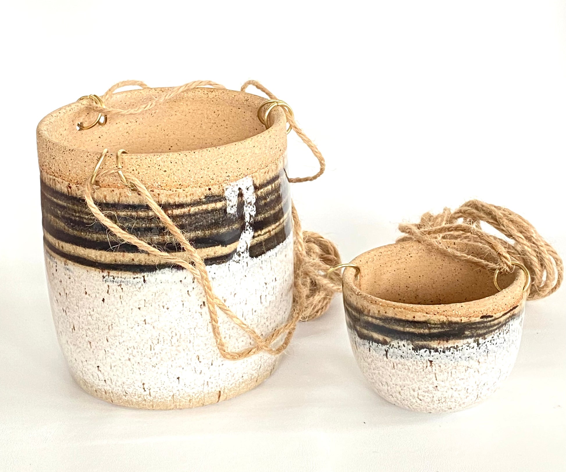 Made with speckled stoneware clay, this ceramic hanging planter features a natural rim, a white speckled body, and free-hand black stripes. Complete with a sturdy twine for secure hanging, it’s perfect for displaying small succulents or herbs, adding a cozy, earthy vibe to your home.