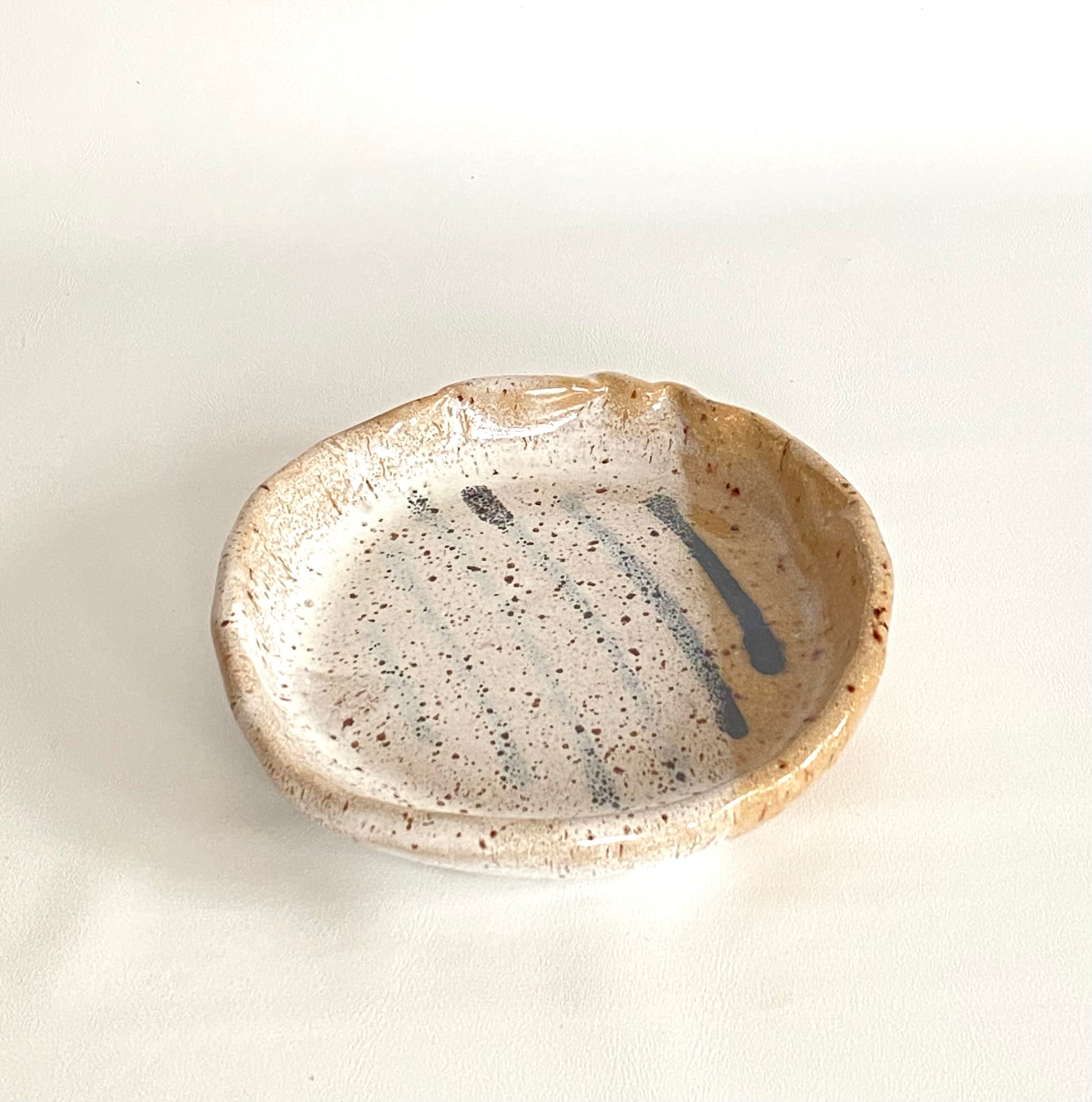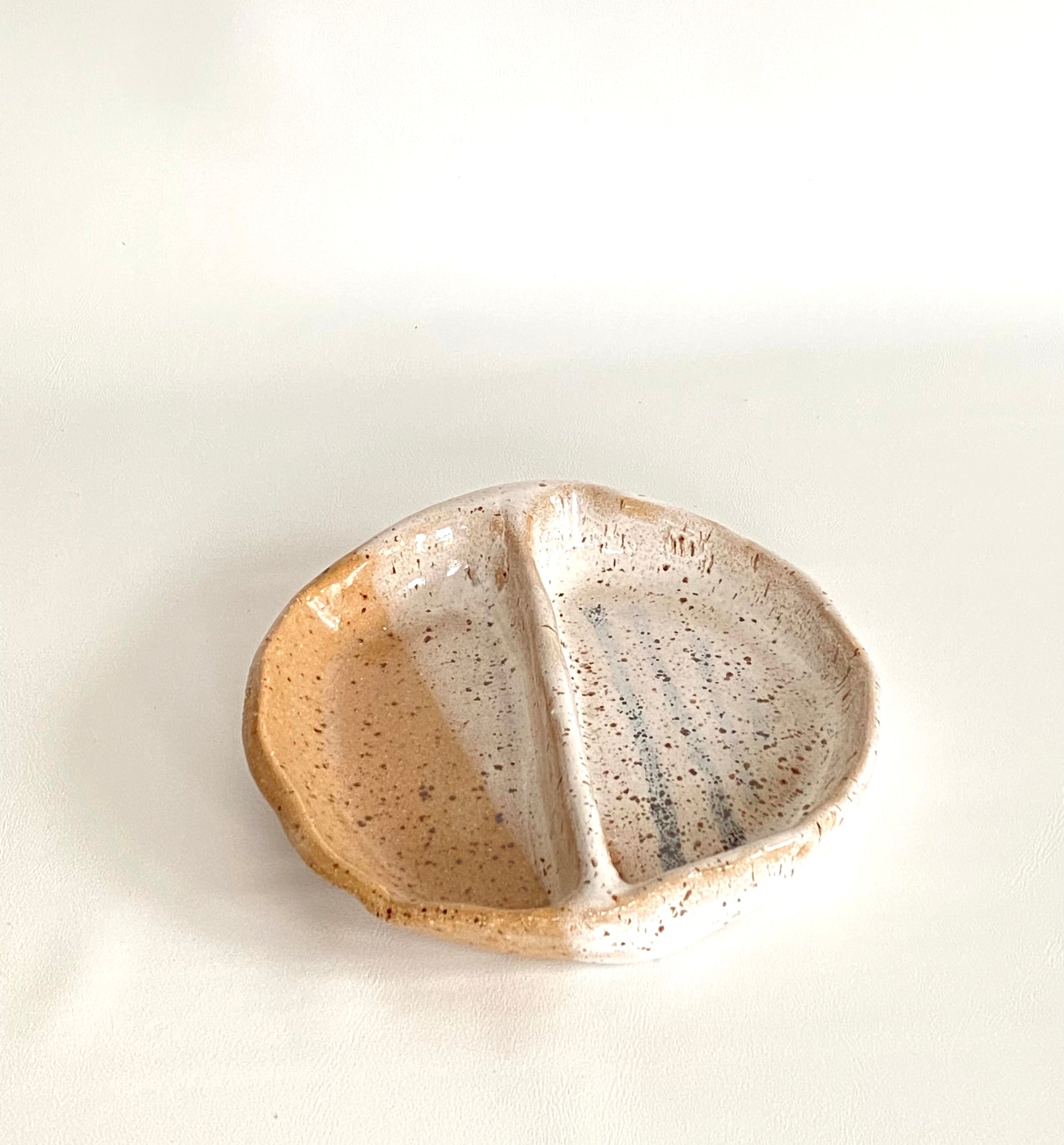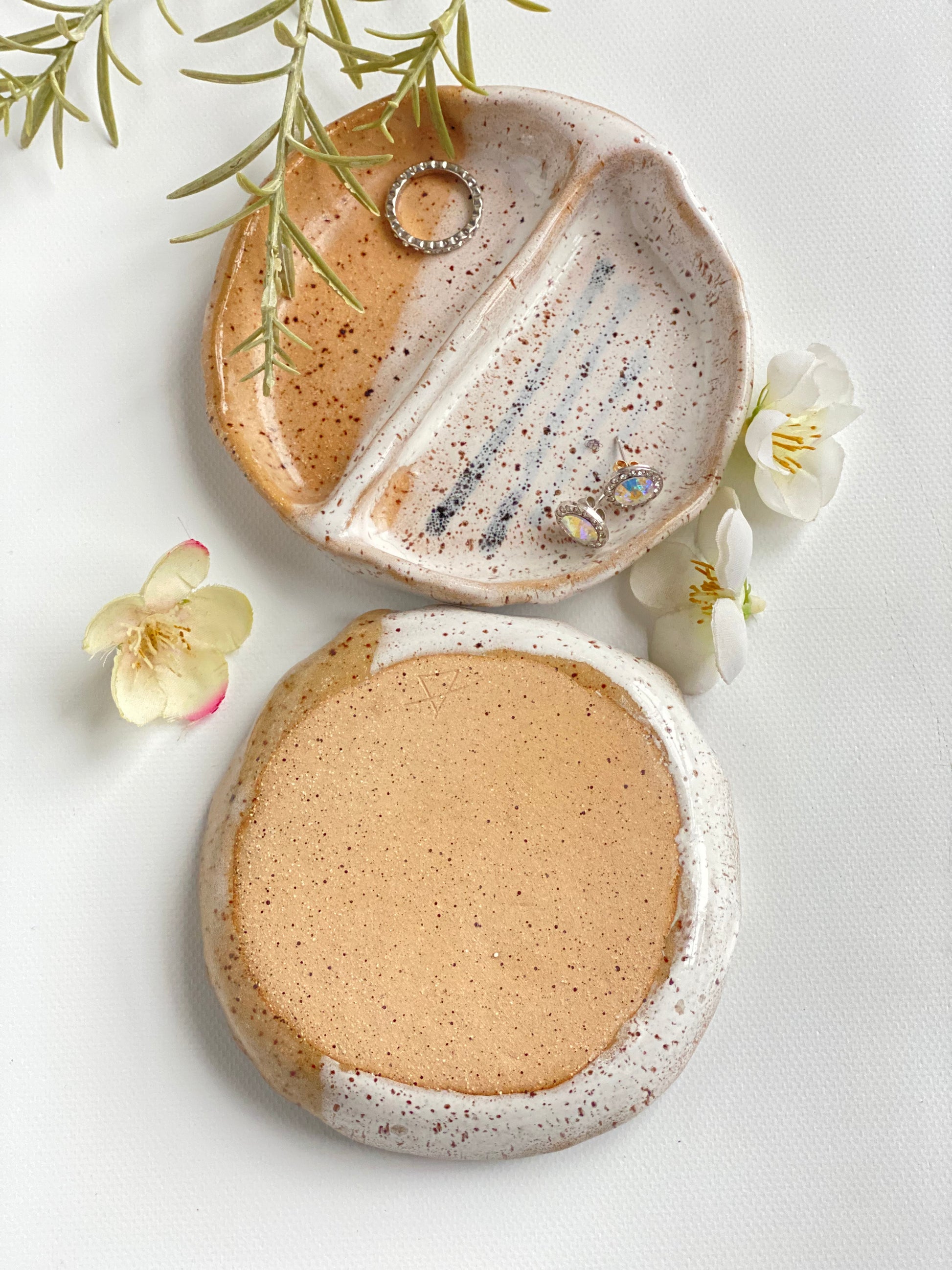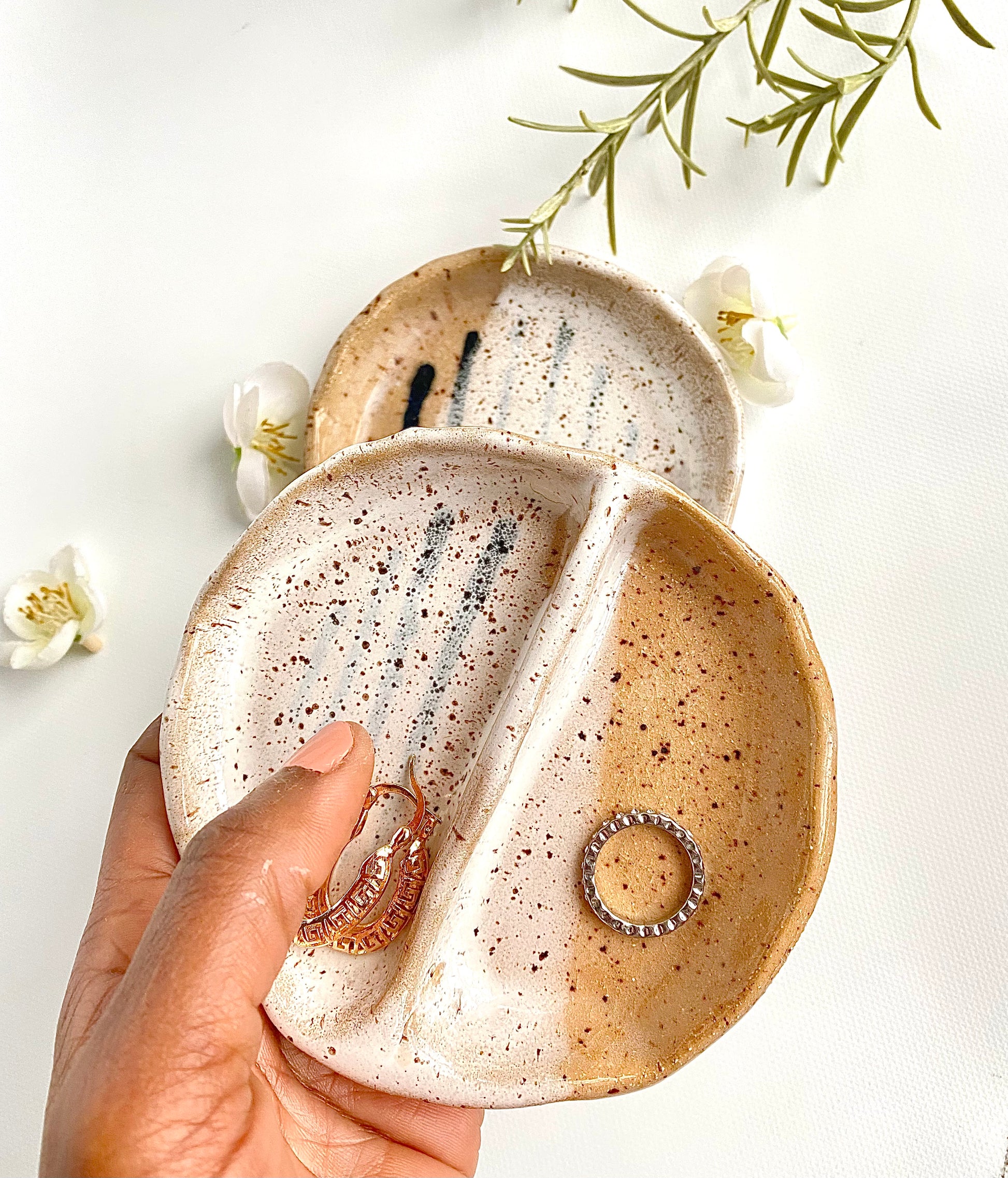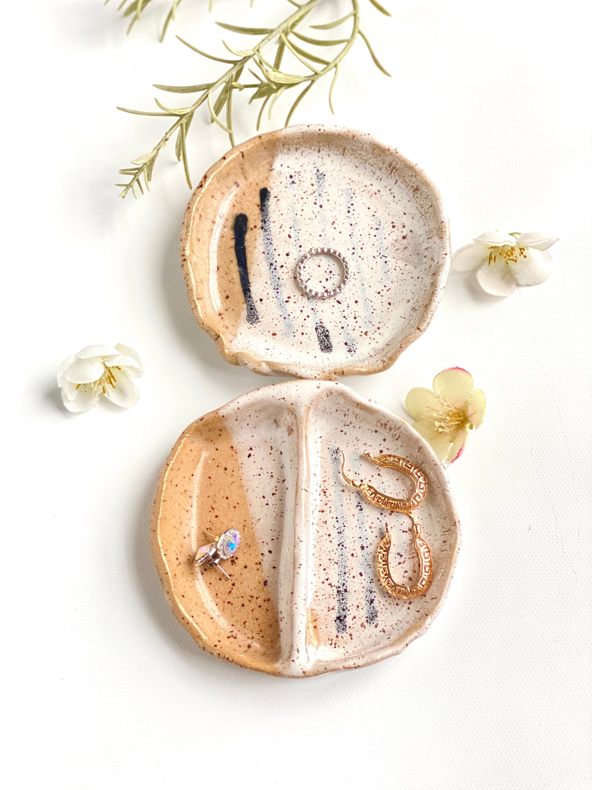 This set of little speckled ceramic plates is as versatile as it is beautiful. The larger plate, with its built-in partition, offers a unique way to separate small personal treasures.