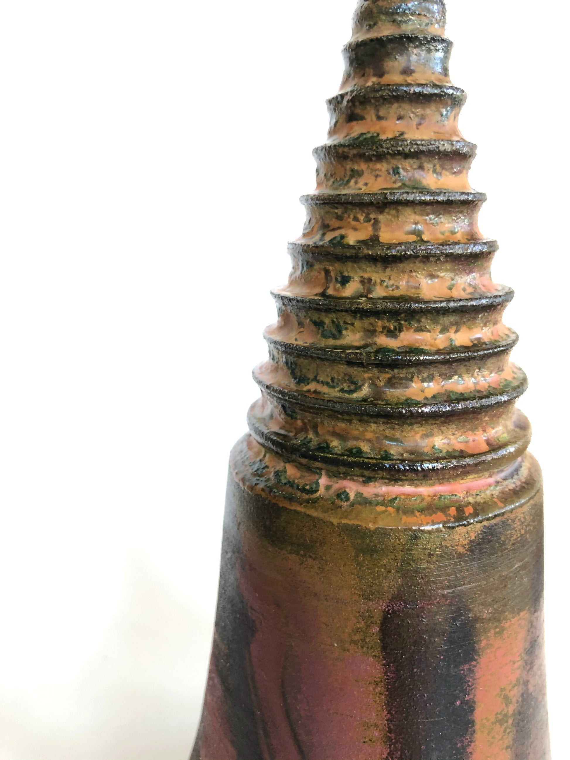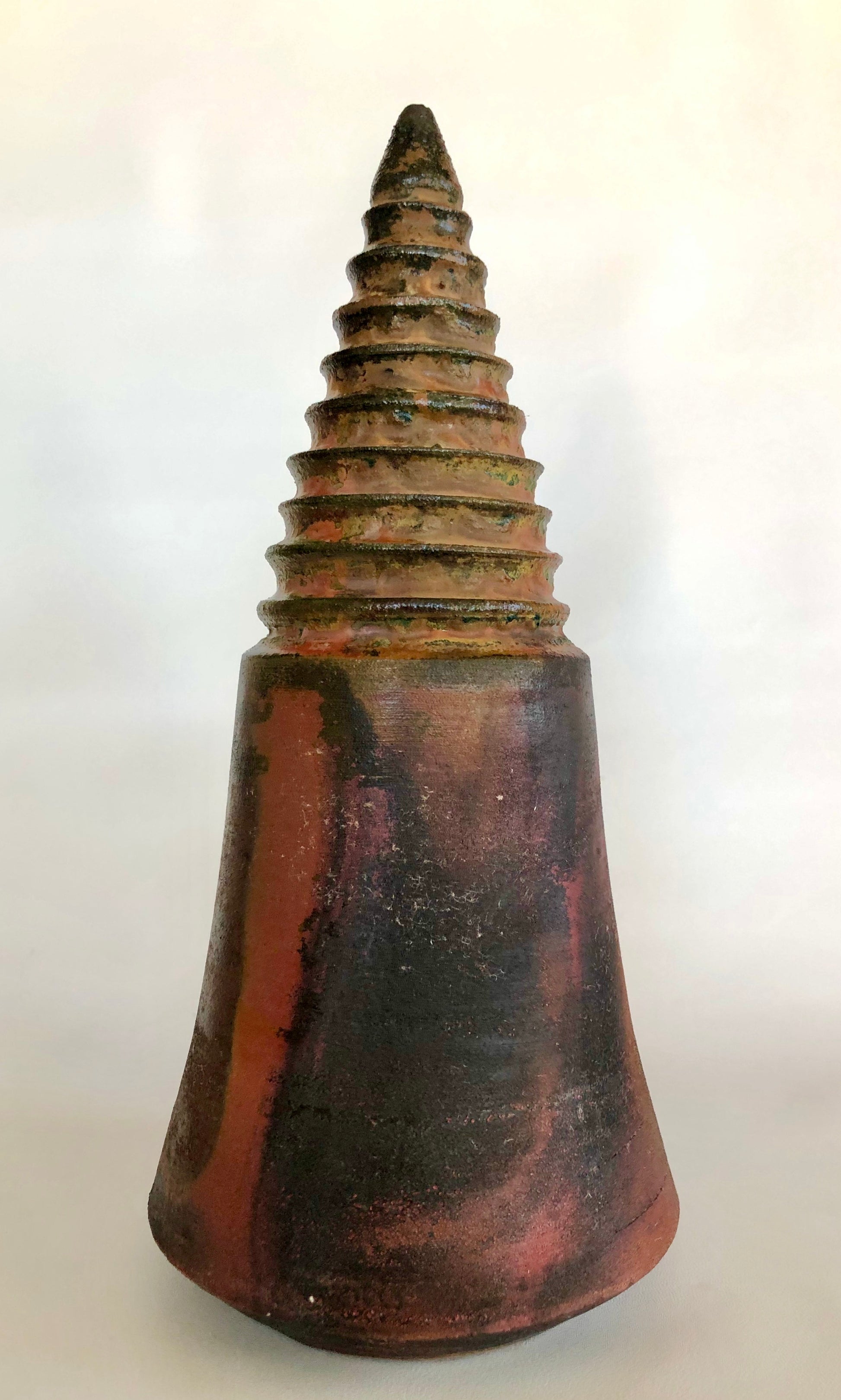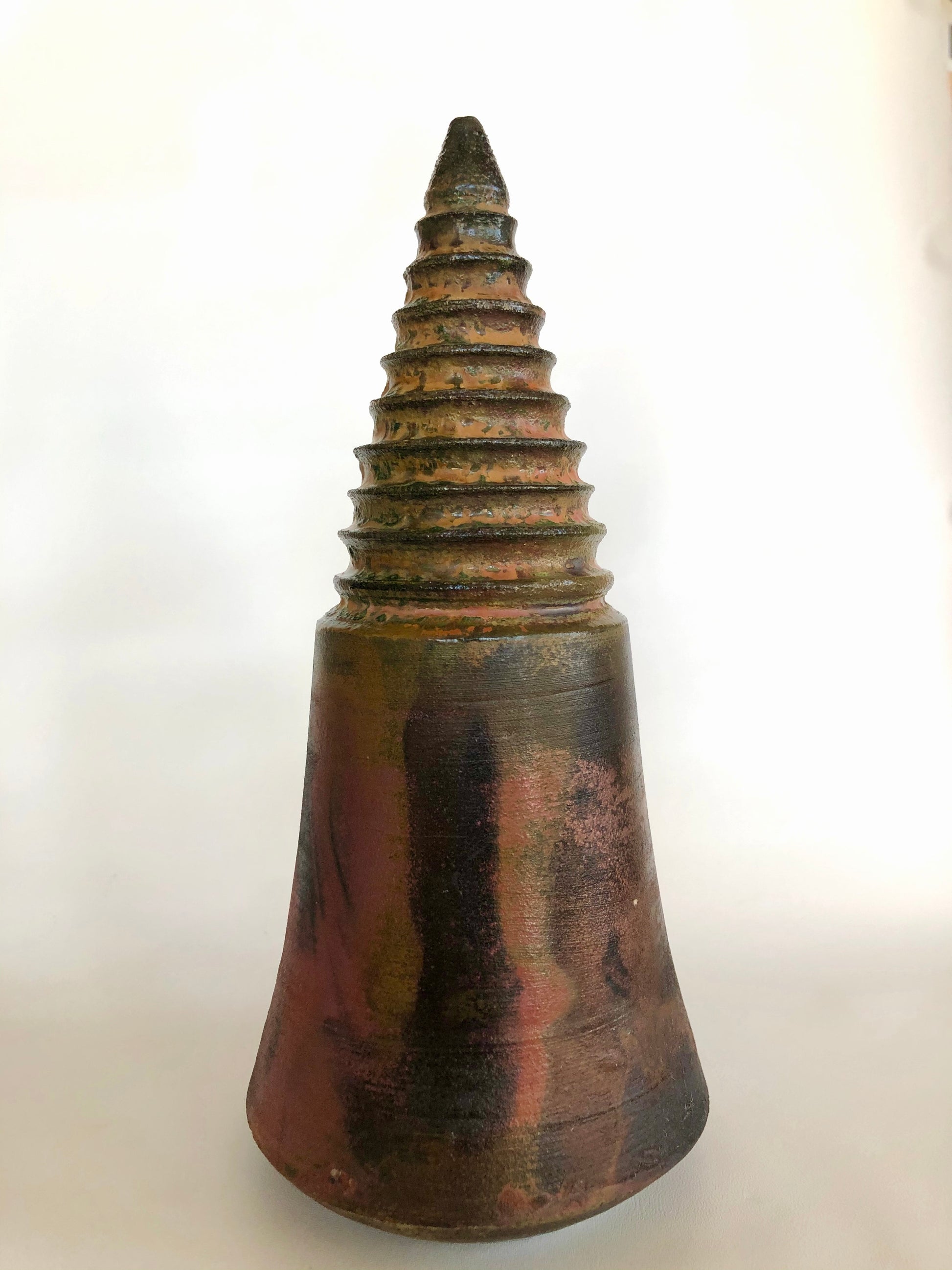 This 'Raku Bullet' is a striking piece formed from raku clay and finished with the transformative raku firing technique. It boasts a dynamic range of smoky colors and rugged textures, making it a bold accent for any contemporary setting.
