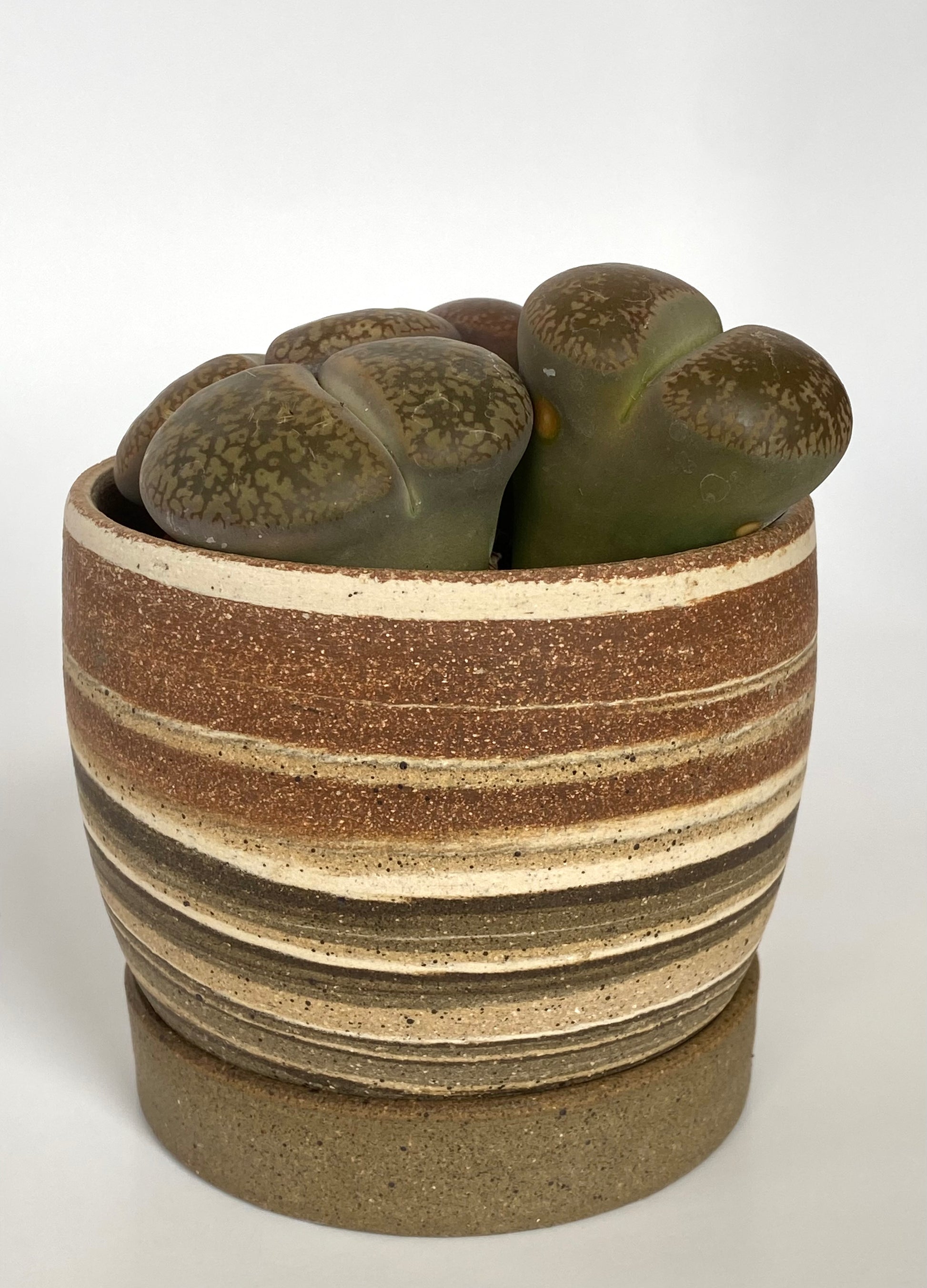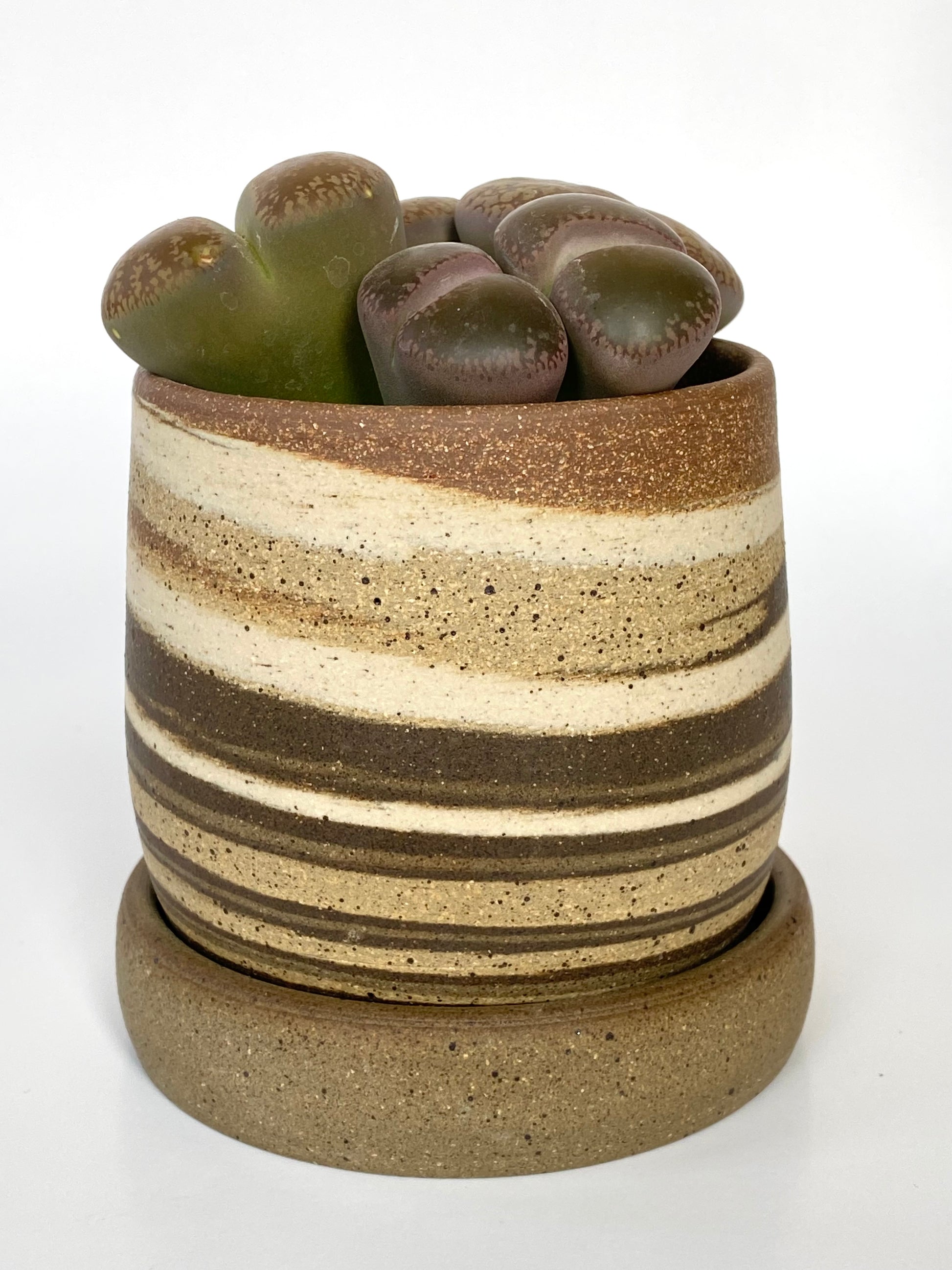 Handcrafted with a blend of four different clay bodies, these small planters showcase striking, natural marbled patterns that make each piece truly one of a kind. Thoughtfully designed with a drainage hole and matching catch plate, they’re perfect for housing succulents, small plants, or herbs.