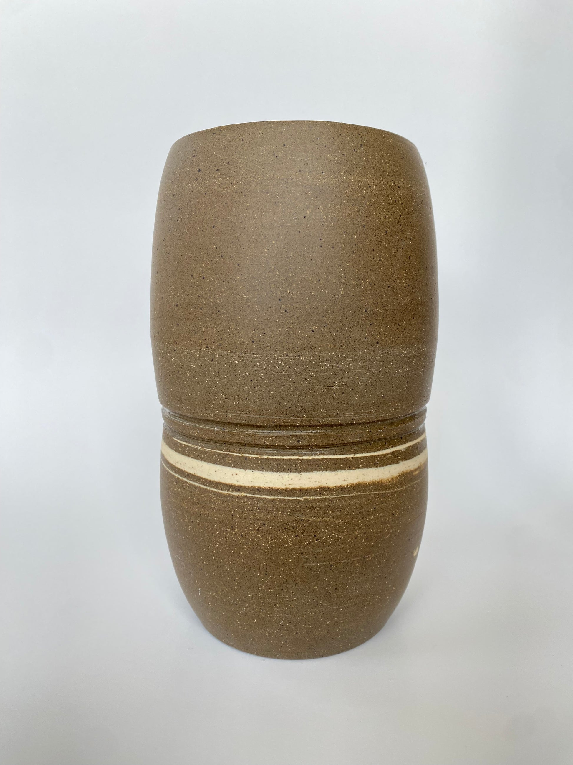 A study in contrast and balance, these handcrafted vases are made from a rich chocolate brown clay body layered with a crisp white clay, creating striking marbled patterns centered around the belly of each form.
