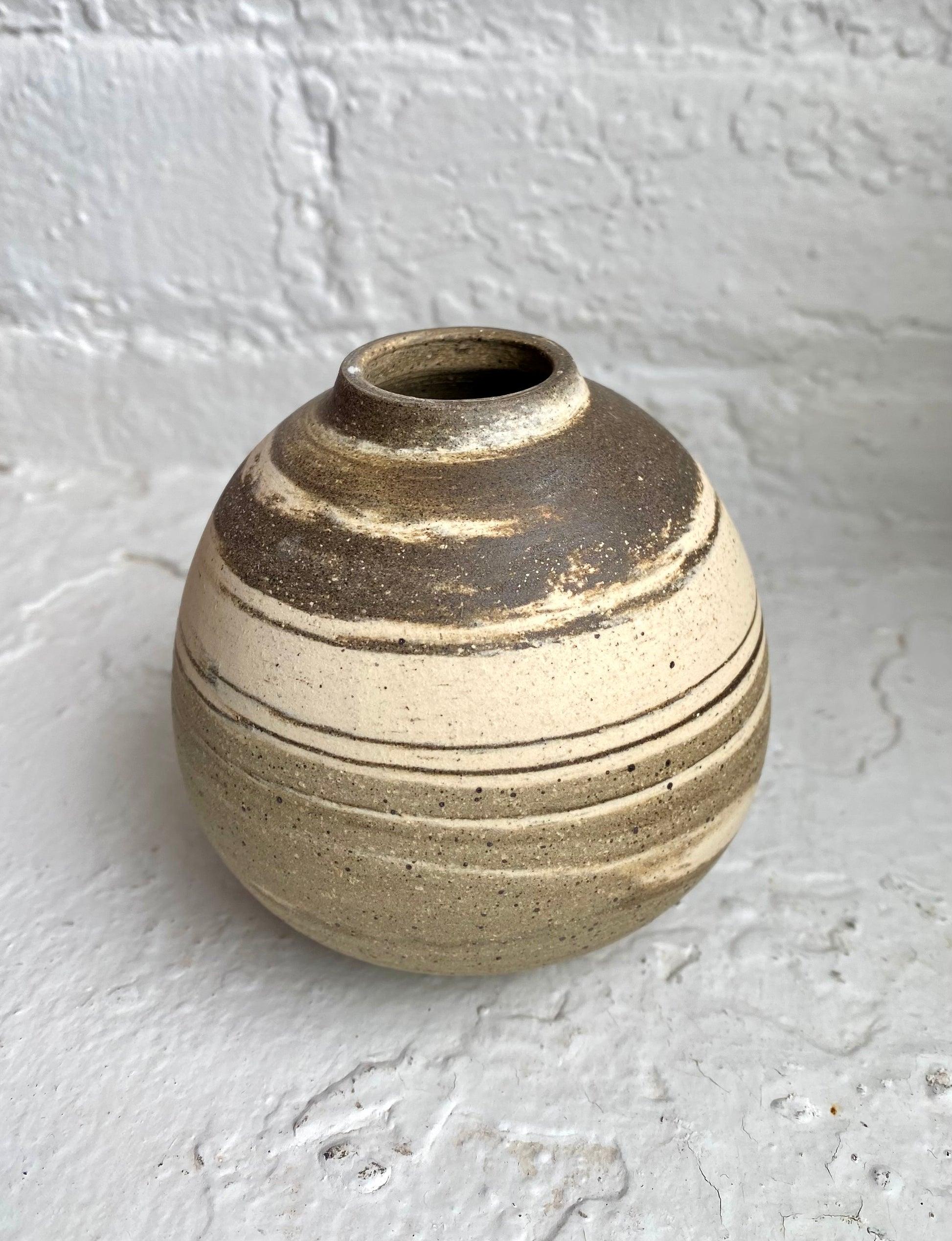 Hand-thrown from a mix of stoneware clays, this mini vase features bold marbling in cream, chocolate, and earthy gray tones. Its compact, rounded shape and smooth, unglazed finish give it a natural, sculptural feel. Great for a single dried stem or displayed on its own.