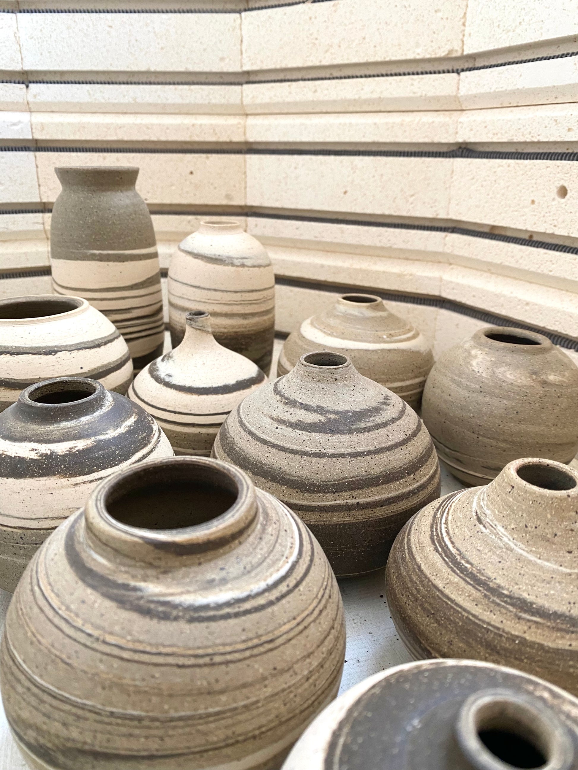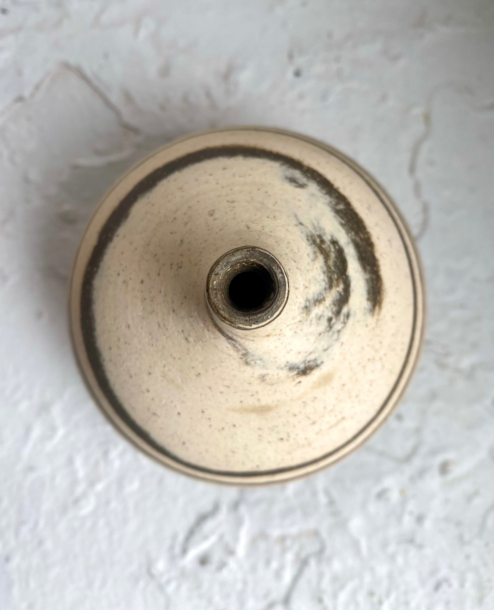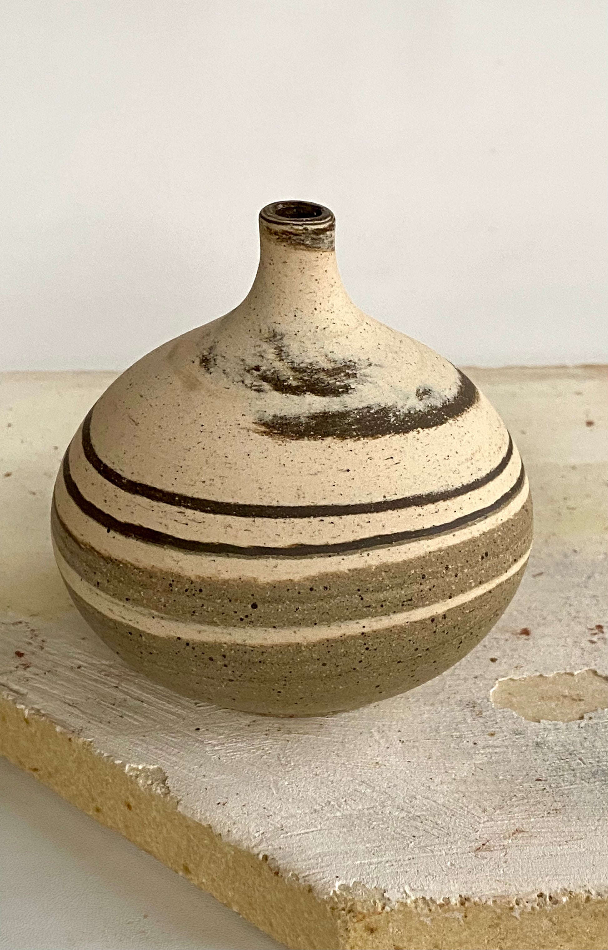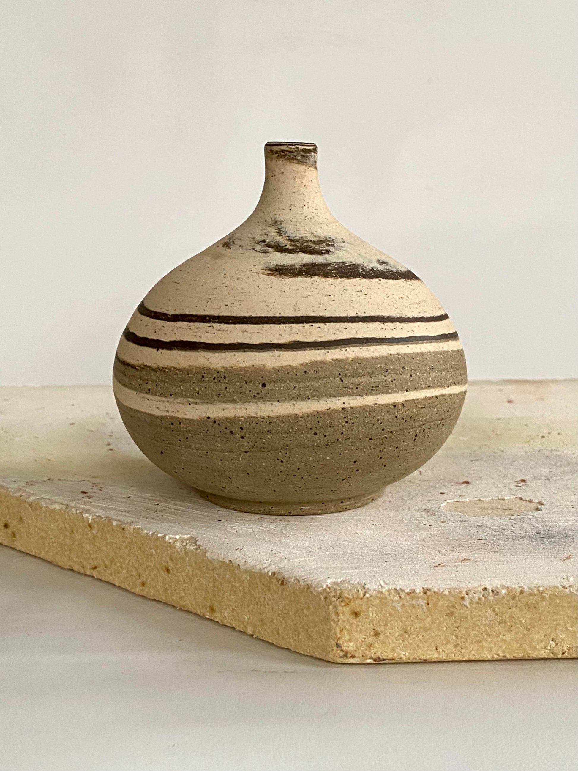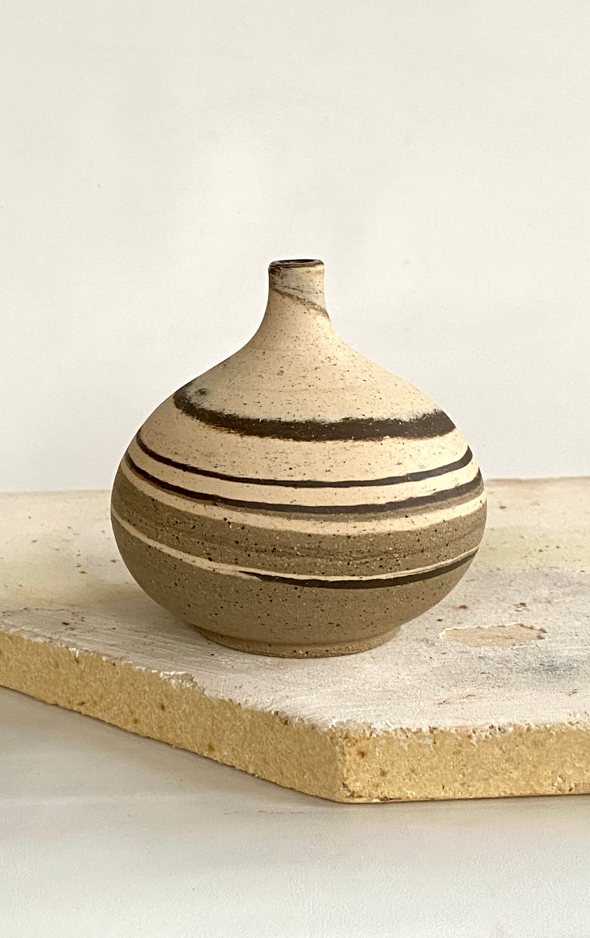 This small, hand-thrown bud vase features a rounded base and narrow neck, crafted from three mixed stoneware clays. The marbled layers swirl gently across the surface, with a mix of soft cream, warm brown, and deep earthy tones. Left unglazed to highlight the raw texture of the clay, it’s perfect for a single dried stem or as a sculptural accent on a shelf or windowsill.